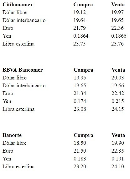 En la primera jornada de la semana, el dólar libre rebasa la barrera de los 20 pesos, y se vende en un precio máximo de 20.03 pesos, 26 centavos más en relación al cierre del viernes, y se compra en un mínimo de 18.50 pesos en bancos de la Ciudad de México.De acuerdo con Banco Base, el peso inicia la sesión con una depreciación ante un incremento de la aversión al riesgo asociada a las economías emergentes, debido a que este domingo en Argentina se llevaron a cabo las elecciones primarias, mejor conocidas como PASO.Explicó que las elecciones mostraron una victoria para la coalición krichnerista encabezada por Alberto Fernández y Cristina Fernández de Krichner, lo que reduce la probabilidad de que Macri gane las elecciones de octubre y eleva la incertidumbre respecto a la estabilidad de las economías latinoamericanas.Respecto a México dijo que la semana es relevante desde el punto de vista interno, pues el jueves se dará a conocer la decisión de política monetaria de Banco de México, en donde se ha comenzado a especular sobre la posibilidad de que la Junta de Gobierno recorte la tasa de interés en 25 puntos base a 8.0 por ciento.No obstante, la institución financiera indicó que es probable que Banxico mantenga su tasa de interés sin cambio en 8.25 por ciento, debido a que todavía persisten riesgos al alza para la inflación, por lo que será necesario observar una mayor convergencia de la inflación (en particular la subyacente) hacia el objetivo del 3.0 por ciento para permitir un ajuste a la baja de la tasa de interés.Durante la sesión, se espera que el tipo de cambio cotice entre 19.60 y 19.80 pesos por dólar.A su vez, el Banco de México (Banxico) informa en el Diario Oficial de la Federación (DOF) que el tipo de cambio para solventar operaciones denominadas en moneda extranjera pagaderas en el país se ubica en 19.4283 pesos por dólar.Asimismo, indica que las Tasas de Interés Interbancarias de Equilibrio (TIIE) a 28 y 91 días se ubican en 8.4450 y 8.3987 por ciento, respectivamente, la primera con una baja de 0.0040 y la segunda con ganancia de 0.0062 puntos porcentuales.AC