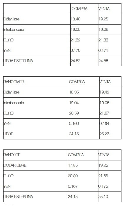 Esta mañana, el dólar libre inicia la jornada con un avance de 13 centavos, respecto al cierre previo, y se vende hasta en 19.42 pesos; mientras que se compra en un precio mínimo de 17.85 pesos en bancos de la Ciudad de México.De acuerdo con Banco Base, el peso inicia la sesión con pocos cambios, mostrando una depreciación moderada, por lo que el tipo de cambio permanece estable, en espera de la publicación en Estados Unidos de la nómina no agrícola de abril, dato que podría mostrar la creación de 200 mil posiciones laborales.De confirmarse que el mercado laboral estadounidense siguió creciendo de forma estable al comienzo del segundo trimestre, el dólar podría volver a fortalecerse hacia el cierre de la semana, expuso.La entidad financiera señaló que en la sesión de ayer (miércoles), en la que los mercados financieros de México permanecieron cerrados por el Día del Trabajo, el tipo de cambio se movió en función de indicadores y noticias externas.Por un lado, se publicó en Estados Unidos el ISM manufacturero de abril, dato que bajó de forma considerable de 55.3 a 52.8 puntos, enviando la señal de que la manufactura está en un proceso de desaceleración, además el gasto en construcción publicado por el Buró del Censo en ese país registró un retroceso.Ello, indicó, permitió que el tipo de cambio bajara de forma temporal. No obstante, por la tarde regresó a niveles cercanos a 19 pesos, luego del anuncio de política monetaria de la Reserva Federal, en donde a pesar de que se mantuvo el mensaje de paciencia, Jerome Powell dijo que no hay tantos riesgos a la baja para la inflación, reduciendo la especulación sobre un posible recorte a la tasa de interés durante el año.Por otra parte, en México, el mercado está atento a la publicación de la encuesta mensual de especialistas del Banco de México.Este 1 de mayo, el Presidente Andrés Manuel López Obrador presentó el Plan Nacional de Desarrollo 2019-2024 en donde reiteró su compromiso de que México crecerá en el sexenio a una tasa promedio de 4.0 por ciento, alcanzando un crecimiento de 6.0 por ciento hacia finales de su periodo presidencial.Lo anterior, a través de una reactivación del consumo interno impulsado por mejores salarios y una recuperación de la inversión.En este contexto, se espera que el tipo de cambio cotice entre 18.90 y 19.15 pesos por dólar.A su vez, el Banco de México (Banxico) informa en el Diario Oficial de la Federación (DOF) que el tipo de cambio para solventar operaciones denominadas en moneda extranjera pagaderas en el país se ubica en 19.0099 pesos.En tanto, las Tasas de Interés Interbancarias de Equilibrio (TIIE) a 28, 91 y 182 días se ubican en 8.5000, 8.5025 y 8.4975 por ciento, la primera y tercera sin cambios y la segunda con un retroceso de 0.0025 puntos porcentuales.Cabe recordar que este miércoles, los mercados financieros en México e instituciones bancarias permanecieron cerrados con motivo del Día del Trabajo.OA
