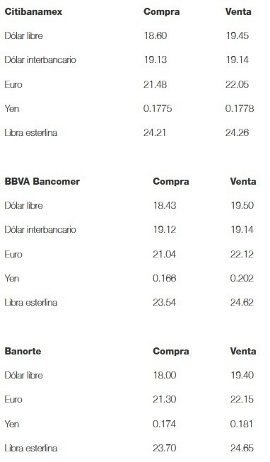 Esta tarde, el dólar libre cierra la jornada con un mínimo avance, al venderse en un precio máximo de 19.50 pesos, un centavo más respecto al cierre de la jornada anterior, y se compró en un mínimo de 18 pesos en bancos de la Ciudad de México.A su vez, el Banco de México (Banxico) fijó en 19.1685 pesos el tipo de cambio para solventar obligaciones denominadas en moneda extranjera pagaderas en la República Mexicana.JM