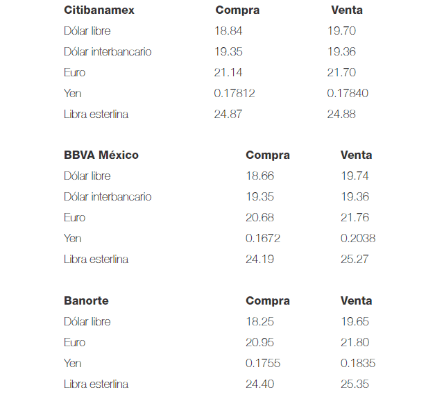 El dólar libre inicia la jornada de este viernes con un descenso de 11 centavos respecto al cierre de ayer, al venderse a un precio máximo de 19.74 pesos y se adquiere en un mínimo de 18.25 pesos en bancos de la Ciudad de México.De acuerdo con el Grupo Financiero Monex, el dólar se deprecia marginalmente ante la incertidumbre comercial entre Estados Unidos y China.En tanto, Banco Base explica que el desempeño de las divisas frente al dólar es mixto, pues sigue habiendo incertidumbre. Entre las divisas que pierden están la lira turca, el yuan chino y el rand sudafricano.Destaca que el peso mexicano alcanzó momentáneamente un máximo de 19.4366 pesos por dólar durante las primeras horas del día, luego de que Donald Trump dijo que el presidente de la Federación Estadounidense del Trabajo (AFL-CIO), Richard Trumka, está presionando a Nancy Pelosi para que no se apruebe el T-MEC, lo que reduce la probabilidad de que el acuerdo sea ratificado en 2019.“Apenas ayer Pelosi señaló, en el marco de una reunión con el representante comercial de Estados Unidos, que no está segura si hay suficiente tiempo para alcanzar un acuerdo y lograr una votación en las próximas semanas", lo que eleva el riesgo de que el tipo de cambio enfrente presiones al alza hacia el cierre del año.La institución financiera precisa que en cuanto a indicadores económicos, en México se publicó la inflación de la primera quincena de noviembre en una tasa interanual de 3.10 por ciento, en línea con las expectativas.Durante la sesión, subraya, se espera que el tipo de cambio cotice entre 19.30 y 19.50 pesos por dólar.El Banco de México (Banxico) publica en el Diario Oficial de la Federación (DOF) que el tipo de cambio para solventar operaciones denominadas en moneda extranjera pagaderas en el país se ubica en 19.4138 pesos por dólar.En tanto, las Tasas de Interés Interbancarias de Equilibrio (TIIE) a 28, 91 días se colocan en 7.7900 Y 7.6500 por ciento, respectivamente, con descensos de 0.0025 y 0.0015 puntos porcentuales, respectivamente.NR