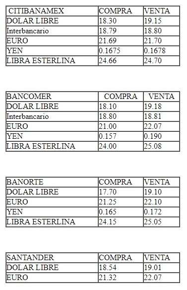 Esta mañana, el dólar libre se oferta hasta en 19.18 pesos, cinco centavos más respecto al cierre de ayer, y se adquiere en un mínimo de 17.70 pesos en sucursales bancarias de la Ciudad de México.De acuerdo con Banco BASE, el peso inicia la sesión con depreciación al igual que la mayoría de las divisas, debido a diversos factores como la expectativa de que la Reserva Federal mantenga un lenguaje restrictivo en las minutas de política monetaria correspondientes a la reunión del 26 de septiembre.Además, de un menor apetito por riesgo en los mercados financieros, particularmente en el mercado de capitales de Europa, en donde los principales índices muestran retrocesos moderados.Así como por la declaración del líder de la mayoría republicana en el Senado de Estados Unidos, Mitch McConnell, respecto a que el acuerdo comercial entre México, Estados Unidos y Canadá (USMCA, por sus siglas en inglés) no será votado en el Senado este año, por los procesos que deben seguir para su aprobación.Expuso que aunque estos comentarios inicialmente no tuvieron un impacto observable en el tipo de cambio, se confirma que muy probablemente será el Congreso elegido en las elecciones intermedias del 6 de noviembre, el que estará en posición de evaluar y aprobar el nuevo tratado trilateral.Señaló que por ahora el riesgo recae en que el Partido Republicano pierda su mayoría en ambas Cámaras tras las elecciones, lo que permitiría al Partido Demócrata usar la aprobación del acuerdo como herramienta de negociación con la administración de Donald Trump, lo que generaría nerviosismo en los mercados.Durante la sesión se espera que el tipo de cambio cotice entre 18.75 y 18.90 pesos por dólar en cotizaciones interbancarias a la venta, agregó.Asimismo, el Banco de México (Banxico) informa en el Diario Oficial de la Federación (DOF) que el tipo de cambio para las operaciones denominadas en la moneda extranjera pagaderas en el país se ubica en 18.7693 pesos.Asimismo, las Tasas de Interés Interbancaria de Equilibrio (TIIE) a 28 y 91 días se ubican en 8.1150 y 8.1550 por ciento, ambas con pérdidas de 0.0050 puntos porcentuales.OA