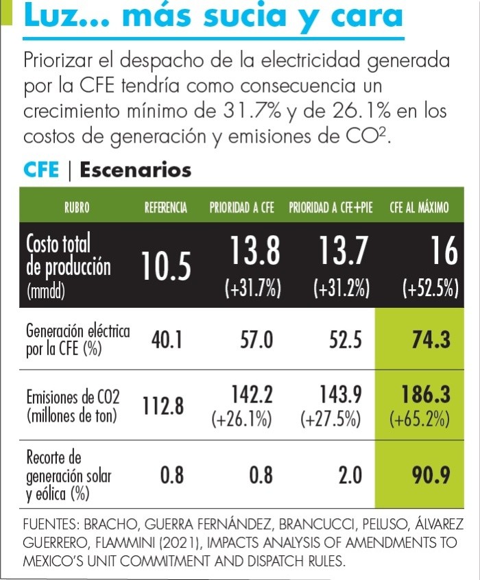 De aprobarse las modificaciones a la Constitución en materia energética planteadas por el gobierno federal que limitan la generación privada y aseguran la mayor parte del mercado a la Comisión Federal de Electricidad (CFE), el costo de generación de electricidad del sistema eléctrico mexicano se incrementará 31.7% como mínimo y hasta 52.5%, lo que equivale a entre 3 mil 322 y 5 mil 567 millones de dólares de costos adicionales.Según el Laboratorio de Energías Renovables de Estados Unidos (NREL, por sus siglas en inglés), en su estudio Análisis de Impactos de las Modificaciones a las Reglas de Compromiso y Despacho de Unidades de México. El NREL es financiado por el Departamento de Energía de Estados Unidos.El organismo planteó tres escenarios, todos de incrementos a los costos de generación eléctrica y una cuota en la generación superior al 54% mínimo legal con que se quedaría la CFE, si se aprueban las modificaciones a los Artículos 25, 27 y 28 de la Carta Magna, en las que el gobierno federal pretende devolver a la CFE el monopolio en comercialización eléctrica.En el escenario de menor participación de terceros y preponderancia de la CFE -que puede darse dada la pérdida de interés de inversionistas en el país-, el despacho dejaría prácticamente fuera a los productores independientes de energía cuyos contratos se renegociarán, la CFE puede llegar a 74.3% de la generación de electricidad, mientras que el costo de generación se disparará 52.5%, lo que implica 5 mil 567 MDD anuales adicionales.En este escenario se requerirá de un incremento de 30% del uso de gas natural para generación de electricidad, y el uso de combustóleo aumentará 11 veces. En tanto, el uso de carbón aumentaría 129%, e implicaría incrementar 65.2% las emisiones de dióxido de carbono, según el NREL.En un escenario intermedio, la generación de la CFE llegaría a 52.5%, los productores independientes de energía participarían casi en su totalidad, como lo hacen en la actualidad vendiendo a la CFE e incluso podrían firmarse más contratos de este tipo, aunque la tecnología que usan no sea preferentemente renovable.