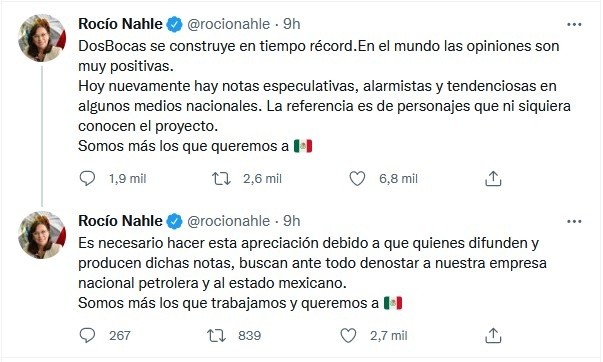 La secretaria de Energía, Rocío Nahle, defendió este sábado que se construye "en tiempo récord" la nueva refinería Dos Bocas ante los reportes en medios sobre retrasos en la obra y un sobrecosto mayor al 50 por ciento."Dos Bocas se construye en tiempo récord. En el mundo las opiniones son muy positivas. Hoy nuevamente hay notas especulativas, alarmistas y tendenciosas en algunos medios nacionales", expresó Nahle en sus redes sociales.Las declaraciones de la secretaria se producen después de un reporte de Bloomberg que estima que la refinería costará 12 mil 500 millones de dólares y no operará en 2022 como pretende el Gobierno.El Presidente Andrés Manuel López Obrador (AMLO) prometió en mayo de 2019 que la refinería, una de sus obras emblemáticas de infraestructura, costaría ocho mil millones de dólares pese a un reporte de Moody's que entonces calculó el costo entre 10 mil y 12 mil millones de dólares.Nahle objetó este sábado que los medios hacen "referencia" a "personajes que ni siquiera conocen el proyecto"."Es necesario hacer esta apreciación debido a que quienes difunden y producen dichas notas, buscan ante todo denostar a nuestra empresa nacional petrolera y al Estado mexicano", sostuvo la funcionaria.La refinería, que procesaría 340 mil barriles diarios, es una de las apuestas de AMLO para "rescatar" a Petróleos Mexicanos (Pemex), la empresa del Estado.AMLO anunció el mes pasado que Pemex dejaría de exportar petróleo en 2023 para procesar dos millones de barriles diarios para consumo interno con la construcción de Dos Bocas, la modernización de las seis refinerías existentes y la recién adquirida Deer Park en Houston, Texas.JM