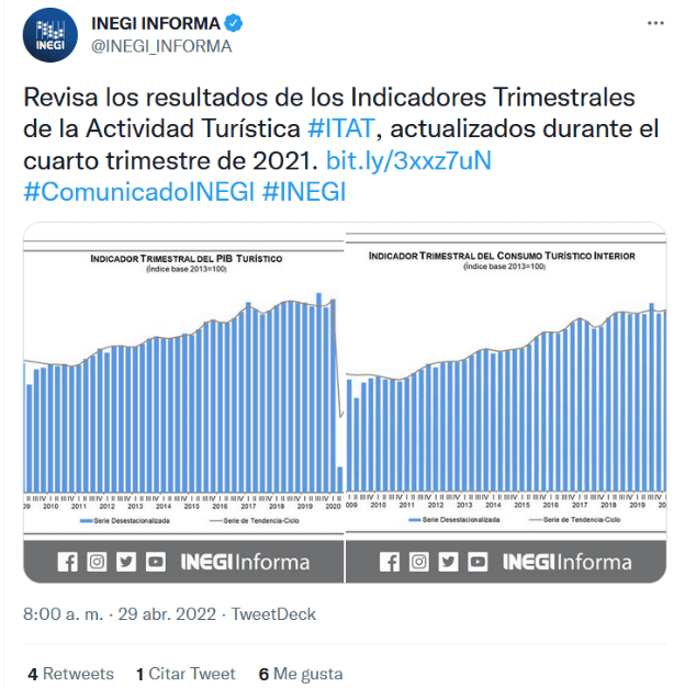 La actividad turística de México repuntó un 19.7 % en el cuarto trimestre de 2021 en comparación con el mismo periodo del año anterior, que estuvo todavía fuertemente afectado por la pandemia del COVID, informó este viernes el Instituto Nacional de Estadística y Geografía (Inegi).Entre octubre y diciembre pasados, el consumo de los turistas extranjeros se disparó un 112.5 % y el gasto del turismo nacional un 9.8 % interanual, explicó la institución en un comunicado.De esta manera, el consumo turístico interior (gasto interno y gasto receptivo) registró un alza del 23.6 % interanual.Por su parte, los servicios ofrecidos a los turistas nacionales y extranjeros, el sector que más contribuye al producto interior bruto (PIB) turístico, avanzó un 22.9 % interanual en el cuarto trimestre de 2021, mientras que los bienes tuvieron un aumento del 4.2 por ciento.En la comparación entre trimestres consecutivos, el PIB turístico del periodo octubre-diciembre de 2021 subió un 4.3 % frente al lapso de julio-septiembre, en cifras desestacionalizadas.Esta subida trimestral fue resultado del aumento de los servicios del 4.7 % y de los bienes del 3.6 por ciento.Mientras que el gasto de los extranjeros (consumo receptivo) creció un 11.5 % y el consumo interno avanzó un 3.6 %. De esta manera, el consumo turístico interior registró un alza trimestral de 5.5 por ciento.México tuvo 31.9 millones de turistas internacionales durante 2021, un 31.3 % más que en 2020.El ingreso de divisas por visitantes internacionales fue de 19 mil 795.6 millones de dólares.Para este 2022, la Secretaría de Turismo (Sectur) estima la llegada de más de 40 millones de turistas internacionales.El PIB turístico de México, que hasta antes de la crisis sanitaria por el coronavirus representaba un 8,6 % del PIB nacional en 2019, cerró 2021 en el 7,1 % y en 2022 lo hará en el 8,3 %, según estimaciones gubernamentales.Aun así, México fue el tercer país más visitado en el mundo en 2020, un fenómeno coyuntural que se atribuye a las medidas sanitarias flexibles en las zonas turísticas del país.México se consolidó en 2019 como uno de los 10 países más visitados del mundo, con más de 45 millones de turistas internacionales que dejaron 24.563 millones de dólares, un crecimiento del 9 % anual.GC
