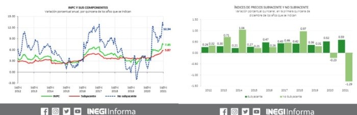 Según informó hoy jueves el Instituto Nacional de Estadística y Geografía (Inegi), la tasa de inflación en México subió en la primera quincena de diciembre hasta el 7.45% interanual, con lo que se mantiene en su mayor nivel de las últimas dos décadas.Ello tras un aumento del 0.10 % del Índice Nacional de Precios al Consumidor (INPC) respecto a la quincena inmediata anterior impulsado por las mercancías, pese a ligeras caídas de los agropecuarios y los energéticos.En el mismo periodo de 2020, hace justo un año, los datos correspondientes reflejaron un aumento quincenal del 0.34 % en el INPC, con lo que la inflación anual quedó entonces en el 3.22 por ciento.En noviembre pasado, México registró una tasa de inflación del 7.37%, el mayor incremento de precios desde 2001, después de que los precios subieran en el undécimo mes del año un 1.14 por ciento.La inflación registrada esta primera quincena de diciembre es mayor a ese dato, pero menor al 7.7% anual que se reportó solo dentro del periodo de la segunda quincena de noviembre.Es "el menor incremento quincenal para dicho periodo en la historia del índice", comentó Julio A. Santaella, presidente del Inegi.El índice de precios subyacente, considerado un mejor parámetro para medir la carestía general porque elimina artículos de alta volatilidad en sus precios, aumentó el 0,59 % en este periodo quincenal.Con ello, dejó la tasa anual en el 5.87%, según señaló el Inegi en un comunicado.Los precios de las mercancías subieron un 0.60 % y los de los servicios un 0.57% quincenal, con respectivas tasas anuales del 2.89 % y del 1.54 por ciento.En los no subyacentes, los agropecuarios retrocedieron un -0.13 % respecto a la quincena anterior y los energéticos y tarifas autorizadas por el Gobierno -0.2 por ciento.Aunque a nivel anual, los precios de los agropecuarios han crecido un 1.71 %, mientras que los energéticos y tarifas se han elevado un 1.29 por ciento.De este modo, la partida de no subyacentes cayó un -0.33 % frente a los quince días anteriores, aunque creció un 3.01 % interanual.Por último, el índice de precios de la canasta de consumo mínimo, conformada por 176 productos y servicios, presentó una reducción quincenal del -0.05 %, pero un aumento del 8.26 % interanual.La inflación de 2020 cerró en un 3.15 %, mientras que en 2019 la inflación fue del 2.83 % y en 2018 los precios al consumidor se elevaron un 4.83 por ciento.Los precios al consumidor escalaron hasta el 6.77 % a finales de 2017, hasta este momento la tasa más alta desde 2000, que fue motivada por un alza en el precio de los combustibles.La meta del Banco de México es del 3 % anual.GC