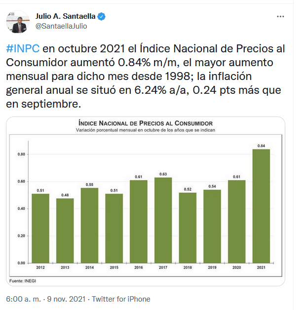 La tasa de inflación mexicana subió en octubre hasta el 6.24%, su mayor nivel desde finales de 2017, tras un aumento de los precios en el décimo mes del año del 0.84% respecto al mes anterior impulsado por los energéticos, informó este martes el Instituto Nacional de Estadística y Geografía (Inegi).En octubre de 2020, hace justo un año, los datos correspondientes reflejaron un aumento del 0.61% en el índice de precios al consumidor (IPC), con lo que la inflación quedó entonces en el 4.09%."En octubre de 2021 el índice nacional de precios al consumidor aumentó 0.84 % mes contra mes, el mayor aumento mensual para dicho mes desde 1998. La inflación general anual se situó en 6.24 % año contra año, 0,24 puntos más que en septiembre ", dijo en Twitter el presidente del Inegi, Julio A. Santaella.En septiembre pasado, México registró una tasa de inflación del 6%, después de que los precios subieran en el noveno mes del año un 0.62 por ciento.Por lo que este dato de octubre refleja un repunte en los precios al consumidor frente al mes precedente.Además, supera el récord de inflación de abril de 6.08%, la tasa más elevada desde finales de 2017.El índice de precios subyacente, considerado un mejor parámetro para medir la carestía general porque elimina artículos de alta volatilidad en sus precios, aumentó el 0.49% mensual y dejó la tasa anual en el 5.19%, según señaló el Inegi en un comunicado.Dentro del subgrupo de bienes y servicios subyacentes, las mercancías aumentaron el 0.60% y los servicios crecieron un 0.38%, con una tasa anual del 6.58% y del 3.64%, respectivamente.En los no subyacentes, los agropecuarios aumentaron un 0.18% respecto al mes anterior y los energéticos y tarifas autorizadas por el Gobierno aumentaron 3.22 por ciento.A nivel anual, los precios de los agropecuarios han crecido un 9.02%, mientras que las tarifas energéticas se han elevado un 9.82 por ciento.De este modo, la partida de no subyacentes aumentó un 1.87% mes contra mes y aumentó un 9.47% interanual.Por último, el índice de precios de la canasta de consumo mínimo, conformada por 176 productos y servicios, presentó un aumento del 0.97% y del 7.15% interanual.El Inegi también anunció que en octubre el índice de precios al productor, incluyendo el petróleo, presentó una variación al alza del 1.49% respecto del mes anterior, alcanzando una variación anual del 8.59 por ciento.La reactivación económica en México llegó tras dos meses de suspensión de todas las actividades económicas no esenciales, en abril y mayo de 2020, debido a la crisis del coronavirus, lo que tuvo un fuerte impacto en la producción y el consumo.La inflación de 2020 cerró en un 3.15%, mientras que en 2019 la inflación fue del 2.83% y en 2018 los precios al consumidor se elevaron un 4.83 por ciento.Los precios al consumidor escalaron hasta el 6.77% a finales de 2017, la tasa más alta desde 2000, que fue motivada por un alza en el precio de los combustibles.La meta del Banco de México es del 3% anual.OF