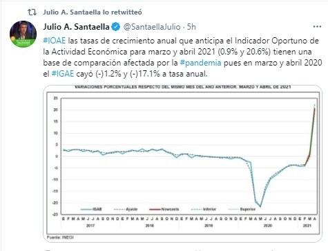 Este martes, el Instituto Nacional de Estadística y Geografía (Inegi) informó que el Indicador Oportuno de la Actividad Económica (IOAE) estima una variación positiva del Indicador Global de la Actividad Económica (IGAE) de 20.6% en abril de 2021 respecto al mismo mes del año anterior, luego de haber reportado una caída de 17.1% en abril de 2020.Esto quiere decir que luego de la profunda caída de la economía mexicana reportada en el cuarto mes del año pasado debido a la emergencia sanitaria por el COVID-19, en abril de 2021 habría repuntado de manera importante debido a una base de comparación muy baja."Las tasas de crecimiento anual que anticipa el Indicador Oportuno de la Actividad Económica para marzo y abril 2021 (0.9% y 20.6%) tienen una base de comparación afectada por la pandemia pues en marzo y abril 2020 el IGAE cayó -1.2% y -17.1% a tasa anual", explicó en su cuenta de Twitter Julio Santaella, presidente del Inegi.Pese a lo anterior y tomando en cuenta el resultado del IOAE, el Inegi estima que la actividad económica habría registrado un retroceso mensual de 0.9% en abril, luego de que en marzo había reportado un alza mensual de 3.9%.Considerando los principales grandes sectores de actividad del IGAE, se tiene que para las actividades industriales se calcula un incremento anual de 34.5% en abril pasado y para el sector servicios un avance anual de 16.4%.Con base en este resultado, las actividades industriales habrían reportado un retroceso mensual de -2.0% en abril, la primera disminución luego de diez meses consecutivos al alza. Por su parte, los servicios habrían reportado una disminución mensual de -0.3%.En su comunicado, el Inegi explicó que el IOAE permite contar con estimaciones econométricas muy oportunas sobre la evolución del IGAE. Así, mientras que el IGAE y sus actividades económicas se dan a conocer aproximadamente ocho semanas después de terminado el mes de referencia, el IOAE presenta sus estimaciones tres semanas después del cierre del mes, adelantadas en cinco semanas a la salida de los datos oficiales.NR