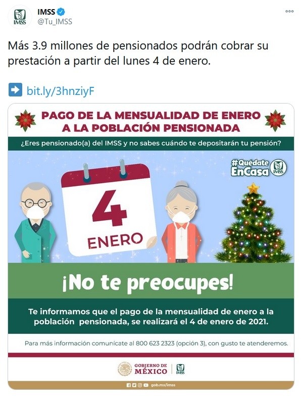 Más de 3.9 millones de pensionados en el país podrán cobrar su prestación a partir del lunes 4 de enero de 2021, informó el Instituto Mexicano del Seguro Social (IMSS).Esto, debido a que el viernes 1 de enero es día feriado y los días subsecuentes corresponden al fin de semana, cabe recordar que los pensionados cobran su pensión el primer día hábil del mes.Por otra parte, el Seguro Social exhorta a la población pensionada a acudir de manera escalonada a las ventanillas bancarias y cajeros, en particular si tienen 60 años o más, por ser más susceptibles a las formas graves de la enfermedad.A los beneficiarios se recomienda retirar los recursos en los días subsecuentes al pago, siguiendo los protocolos sanitarios y realizar compras con tarjetas bancarias en establecimientos autorizados.Además, es aconsejable retirar los recursos en corresponsales bancarios como tiendas de autoservicio, así como utilizar servicios de banca en línea para el pago de diversos bienes y servicios.El IMSS tiene habilitado el teléfono 800 623 2323, (opción número 3) que corresponde a "Pensionados", para ser atendidos por un representante del IMSS y atender dudas y comentarios.OA