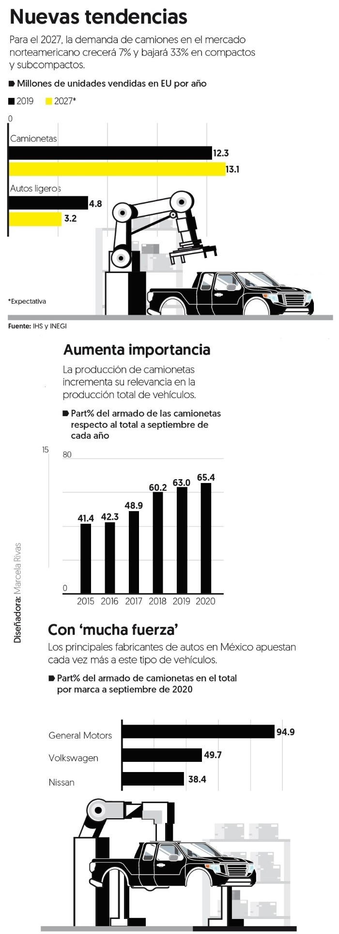 México acelerará su producción de camionetas sobre autos compactos y subcompactos, gracias al inicio del armado de las nuevas camionetas Ford Bronco en Hermosillo, Sonora, el Volkswagen Taos en Puebla y por el anuncio de ampliación de la planta de Toyota en Guanajuato donde crecerán la fabricación de las pick ups modelo Tacoma.El armado de camionetas arrancó desde hace cinco años en México, sin embargo, especialistas y representantes de la industria refieren que el proceso se aceleró debido a que en el futuro prevén una mayor demanda de camionetas, en detrimento de los compactos y subcompactos.Cifras de IHS proyectan que para 2027 en Estados Unidos se venderán 13.1 millones de camionetas –la Unión Americana es el principal importador de vehículos hechos en México–, esta cifra es superior a los 12.3 millones vendidos en 2019; mientras que de autos compactos se prevé la comercialización de 3.2 millones, inferior a los 4.8 millones que tuvieron el año pasado.“La venta de autos de pasajeros casi desaparece por la pandemia, donde vemos una recuperación más rápida es sobre camionetas y eso tiene que cambiar a México su forma de ver las cosas”, dijo en entrevista Guido Vildozo, gerente senior en análisis de venta de autos ligeros en América de la consultora IHS Markit.Refirió que será importante para los armadores en el país especializarse en el segmento de camionetas, pues la mayoría de los autos en México no compiten en el mundo porque se comercializan primordialmente en Norteamérica.Entre enero y septiembre de 2020, México produjo en el país un millón 349 mil 213 camionetas pick up, SUV y minivan, lo que representó 65.4 por ciento del total de vehículos ligeros ensamblados en el periodo, muestran datos del Instituto Nacional de Estadística y Geografía (INEGI).Esta participación es la más alta desde que se tiene registro, además de que es 24 puntos porcentuales mayor a lo que pesaba hace cinco años; ahora con los nuevos modelos que comenzarán a producirse en el último trimestre de 2020 se acelerará el proceso.“Solo 39.5 por ciento son vehículos utilitarios que son SUV, y 25.9 por ciento son pick ups, el resto son autos compactos, subcompactos y de lujo. Es relevante decir que las pick ups y SUV prácticamente regresamos a los niveles previos a la pandemia, los que no recuperan es la producción de autos compactos. (…) Pero con esto ya se está ocupando 81.5 por ciento de la capacidad instalada”, afirmó Fausto Cuevas, director general de la Asociación Mexicana de la Industria Automotriz (AMIA).General Motors, el principal fabricante de vehículos en México, reportó la producción de 501 mil 75 camiones entre enero y septiembre de 2020, lo que representa 94.9 por ciento del total de unidades ensambladas en el país.Mientras que otros casos como Volkswagen reportaron que en los primeros nueve meses del año este tipo de unidades representó 49.7 por ciento del total de su producción y de Nissan el 38.4 por ciento.En el caso de Ford, apenas comenzarán en el último trimestre la producción de camionetas, por lo cual esperan que el armado se refleje más adelante en sus números.“Nos encontramos muy emocionados por este periodo de transición que marca el inicio de los trabajos de retooling o adaptación de las instalaciones para la manufactura de los próximos vehículos que se producirán en nuestras plantas de Hermosillo y Cuautitlán. Durante este periodo planificado, 100 por ciento de nuestros colaboradores estarán laborando de manera parcial y asistiendo a entrenamientos con la finalidad de prepararse para una nueva era”, respondió la empresa a El Financiero.El aumento en el contenido regional en la producción automotriz de Norteamérica por el Tratado México, Estados Unidos y Canadá (T-MEC), significaría la atracción de mayor inversión de autopartes a suelo azteca, pero no necesariamente para hacer nuevas piezas, dijo Guido Vildozo, gerente senior en análisis de venta de autos ligeros en América de la consultora IHS Markit.“No es fácil mover una cadena de proveeduría de un país a otro, pues son muchos eslabones los que se deben considerar; es más fácil considerar lo que ya tiene el país e incrementar su capacidad”, dijo.Previamente Óscar Albín, presidente de la Industria Nacional de Autopartes (INA), comentó que hay experiencia en México en diferentes piezas, pero este tratado los impulsará.“Los automotores deben incrementar paulatinamente el consumo de piezas hechas en Norteamérica por el nuevo acuerdo comercial, es una oportunidad para México por la experiencia que tiene en diferentes partes (internos y externos)”, dijo