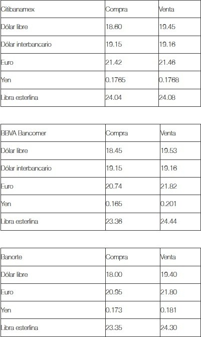 El dólar libre concluyó la jornada de este martes con un ligero retroceso de un centavo respecto al cierre de ayer, al venderse en un precio máximo de 19.53 pesos, y se compró en un mínimo de 18 pesos, en bancos de la Ciudad de México.A su vez, el Banco de México (Banxico) fijó en 19.1011 pesos el tipo de cambio para solventar obligaciones denominadas en moneda extranjera pagaderas en la República Mexicana.JM
