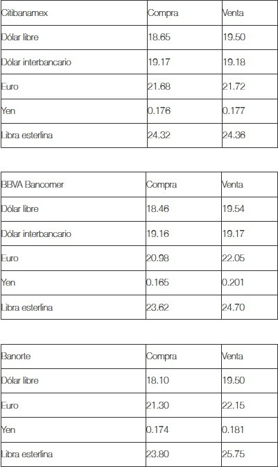 Al cierre de la jornada cambiaria del primer día de la semana, el dólar libre registró un retroceso de 39 centavos en comparación con el pasado viernes, al venderse en un precio máximo de 19.54 pesos y se compró en un mínimo de 18.10 pesos, en bancos de la Ciudad de México.El Banco de México (Banxico) fijó en 19.2040 pesos el tipo de cambio para solventar obligaciones denominadas en moneda extranjera pagaderas en el país.JM