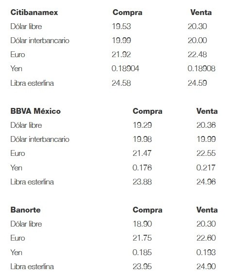 Esta tarde, el dólar libre se vendió hasta en 20.36 pesos, lo que representó una ganancia de ocho centavos frente al cierre previo, y se compró en un precio mínimo 18.90 pesos en bancos de la Ciudad de México.El Banco de México (Banxico) fijó en 19.9934 pesos el tipo de cambio para solventar obligaciones denominadas en moneda extranjera pagaderas en el país.JM