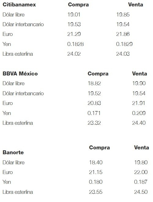 Al término de la sesión cambiaria de este viernes, el dólar libre se vendió en un precio máximo de 19.90 pesos, es decir, 15 centavos menos comparado con el cierre previo, y se compró en un mínimo de 18.40 pesos en sucursales bancarias de la Ciudad de México.El Banco de México (Banxico) fijó en 19.5623 pesos el tipo de cambio para solventar obligaciones denominadas en moneda extranjera pagaderas en la República Mexicana.• Dólar abre con pérdidas, se vende hasta en 19.94 pesosJM