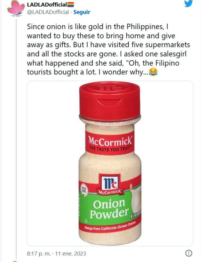 En muchos lugares del mundo, las cebollas son un alimento básico, mientras que la carne es más un lujo, pero en Filipinas su precio se ha disparado por encima del pollo o la carne de res.La costumbre de saltear con ajo y cebolla en el país asiático se remonta a la época de la colonización española, que duró entre 1521 y 1898 e influyó mucho en su cocina.Sin embargo, durante casi un mes, las cebollas se han convertido en un artículo de lujo para los filipinos. Después de un aumento en los precios, la verdura cuesta más que muchos tipos de carnes.El kilo de cebollas rojas y blancas alcanzó esta semana unos US$11, mientras que un pollo entero se podía comprar por unos US$4.Esta cifra es más alta que el salario mínimo diario en Filipinas, que se sitúa en torno a los US$9.Con el aumento de los precios, las autoridades del país incluso han incautado envíos ilegales de cebolla.A principios de enero, se interceptaron cebollas de China por un valor de US$310.000 después de un intento de contrabandearlas como si fueran ropa.En las redes sociales, los filipinos han publicado mensajes graciosos criticando al gobierno, al que muchos culpan en parte de la situación actual."Adiós chocolates, hola cebollas. Las sibuyas [cebolla] tiene potencial para convertirse en el mejor pasalubong [regalo] para llevar a casa en Filipinas", publicó en Twitter un filipino que vive en Estados Unidos."Regresamos con cebollas en lugar de chocolates de nuestro viaje a Arabia Saudita", escribió otro.Otro usuario que también viajó a Estados Unidos compartió una imagen de un frasco de cebolla en polvo."Como la cebolla se ha vuelto tan valiosa como el oro en Filipinas, quería comprar estos tarros para llevar a casa y regalar", se lee."Pero he visitado cinco supermercados y todas las existencias están agotadas"."Le pregunté a una vendedora qué pasó y me dijo que los 'turistas filipinos los habían comprado todos'", cuenta.Nicholas Mapa, economista sénior del banco ING que vive en la capital de Filipinas, Manila, dijo que algunos restaurantes incluso han dejado de vender productos que contienen cebollas.Las porciones de aros de cebolla que normalmente vienen con las hamburguesas, por ejemplo, han desaparecido de algunos menús."No pueden fijar el precio de sus productos correctamente o simplemente no pueden suministrar cebollas", le dijo a la BBC por correo electrónico.Algunas empresas están buscando alternativas.El cocinero Jam Melchor, fundador del Movimiento para Preservar el Patrimonio Culinario de Filipinas, ha estado buscando reemplazos.Finalmente, ha recurrido a un tipo de cebolla autóctona llamada lasona, que tiene un sabor diferente a las variedades utilizadas tradicionalmente y es muy pequeña, del tamaño de una uva."Tanto los restaurantes como la población en general han sufrido la situación. El precio actual de las cebollas es demasiado alto, por lo que estamos tratando de aprovechar al máximo las alternativas que tenemos disponibles", le dijo a la BBC."Las cebollas son muy importantes para la cocina local. Están presentes en casi todos los platos que preparamos aquí. Es un ingrediente crucial en toda la cocina filipina", agregó Melchor.Nicholas Mapa dice que hay al menos dos factores detrás del aumento de los precios.Las proyecciones del Departamento de Agricultura publicadas en agosto indicaron que el país produciría menos cebollas de las necesarias.La cosecha fue peor de lo esperada, ya que Filipinas se vio afectada por un gran tifón entre agosto y septiembre."Lamentablemente, las importaciones de cebolla comenzaron tarde, solo después de que los precios se dispararan, y muy cerca del período de cosecha, que es en febrero", explicó el economista.En la primera semana de enero, el gobierno aprobó la importación de alrededor de 22 millones de toneladas de cebolla para intentar normalizar la oferta y controlar los precios.Para algunos expertos como Fermín Adriano, quien alguna vez fue asesor del Departamento de Agricultura, la gestión de esto ha sido un fracaso de la actual administración.En su opinión, dado que el gobierno sabía que la producción nacional era baja, debería haber ordenado importaciones suficientes para al menos igualar la oferta con la demanda esperada.En las redes sociales, algunos filipinos ven una conexión entre la gestión desorganizada del sector agrícola y el hecho de que el controvertido presidente Ferdinand Marcos Junior, conocido como "Bongbong" y elegido el año pasado, se autoproclamara ministro de Agricultura.Y eso pese a su falta de experiencia en el tema.Es hijo del ex dictador Ferdinand Marcos, quien dirigió un régimen brutal en Filipinas en las décadas de 1970 y 1980, y fue derrocado por protestas populares que obligaron a la familia a huir del país en 1986.En 1991, Bongbong regresó a Filipinas y se embarcó en una carrera política.Fue gobernador, diputado y senador antes de ser elegido presidente.Parte de la campaña de Marcos se basó en tratar de vender a los votantes la idea de que la dictadura fue una "edad de oro", expresión que muchos han utilizado irónicamente en las redes sociales, escribiendo en tono de broma que el "oro" al que se refería el político era el precio de las cebollas.Cindy van Rijswick, analista de Rabobank, dice que, tradicionalmente, Filipinas es un país importador de cebollas: consume más de lo que produce.Esta necesidad fluctúa mucho: mientras en 2011 necesitó cinco millones de kilos, en 2016 fueron a 132 millones."El país suele comprar a India, China y Holanda, dependiendo del precio y la disponibilidad", dijo el analista.Una de las razones de esta dependencia es que la mayor parte de la producción de cebolla de Filipinas, dadas las condiciones climáticas, es de variedades con una vida útil corta.Esto es diferente de lo que sucede, agrega Van Rijswick, en algunas regiones del norte de Europa y América del Norte, donde, con las condiciones adecuadas, las cebollas se pueden almace