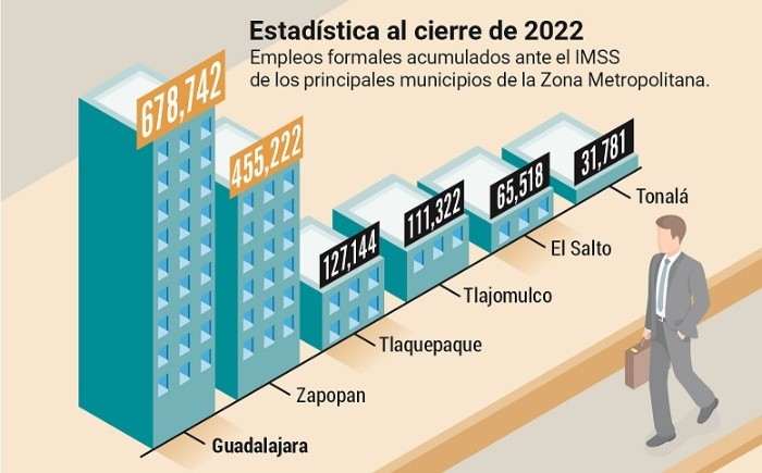 De acuerdo con datos del Instituto Mexicano del Seguro Social (IMSS) y del Instituto de Información Estadística y Geográfica de Jalisco (IIEG), Guadalajara cerró 2022 con el mayor número de empleos formales acumulados en el Estado: la capital de la Entidad registró 678 mil 742 (más de una tercera parte de las plazas a nivel estatal).Con esa cifra dejó en segundo lugar a Zapopan, que mantuvo durante siete años la primera posición. En esta ocasión, en el municipio gobernado por Juan José Frangie se reportaron 455 mil 222. Ante estos resultados, el alcalde tapatío, Pablo Lemus Navarro, destacó que 2022 fue muy positivo en esta materia para el municipio gracias a la labor que se hizo con la Iniciativa Privada (IP). Explicó que a lo largo del último año se concentraron los esfuerzos en la recuperación económica tras las afectaciones que dejó la emergencia sanitaria por el COVID-19. “Los avances registrados son la clara muestra de que hemos tomado las decisiones correctas para trazar el camino hacia la construcción de una Guadalajara cada vez más próspera”, dijo. Lemus Navarro agregó que además de esto, Guadalajara también fue ejemplo en fuentes de trabajo en el sector turístico.“Adicionalmente, la ciudad de Guadalajara se convirtió en la principal generadora de empleo en el sector turístico por encima de Puerto Vallarta. Este es un dato muy importante porque tiene que ver con la recuperación del Centro Histórico, del turismo de negocios, de la Expo Guadalajara... Guadalajara es la cuna de la mexicanidad a nivel mundial, su colorido e innumerables atractivos turísticos, culturales y gastronómicos la han consolidado como destino predilecto para el turismo, especialmente el que está enfocado a los negocios”, agregó el primer edil.El pasado 1 de febrero, la Coparmex Jalisco indicó que en 2023 prevé que se generen alrededor de 78 mil nuevos puestos en la Entidad, principalmente en la Industria de la Transformación, Construcción y Servicios. En esa fecha, el organismo acentuó que la expectativa proyecta una derrama económica estimada en mil 179 millones de pesos (MDP) que se verán reflejados en la economía de los hogares jaliscienses. Al cierre del primer mes de este año en Guadalajara se crearon dos mil 120 empleos asegurados ante el IMSS. La capital tapatía cerró enero con una acumulación de 680 mil 862, lo que representó un incremento de 0.31 por ciento comparado con el mes anterior.El Gobierno de Jalisco informó que en todo el Estado fueron generados 18 mil 294 nuevos trabajadores registrados ante el Instituto Mexicano del Seguro Social (IMSS) durante el primer mes del 2023.Esto colocó a Jalisco como el segundo mayor generador de empleos en el país, por debajo de Baja California con 18 mil 836 trabajadores asegurados; cabe destacar que la generación de empleos en la Entidad durante el primer mes de 2023 es la más alta históricamente para un mes de enero de los últimos 25 años.“A pesar de los retos y coyunturas mundiales y nacionales, el Gobierno de Jalisco refrenda su compromiso con el sector productivo, a fin de seguir propiciando las condiciones para la inversión, la generación de confianza y certeza, para continuar ofreciendo oportunidades de crecimiento y desarrollo en el presente y futuro a todos los jaliscienses” dice un comunicado.“En unidad, con rostro humano, liderazgo, ritmo y rumbo claros, nuestro Estado sigue mostrando dinamismo, crecimiento y diversificación económica, y con un liderazgo claro y diferenciador, se consolida como la locomotora del crecimiento y desarrollo económico de México”, afirmó el coordinador General Estratégico de Crecimiento y Desarrollo Económico, Xavier Orendáin de Obeso.“Un nuevo empleo significa la posibilidad de un nuevo y mejor nivel de vida para una familia, y eso es lo que está sucediendo en Jalisco gracias a la confianza de los empresarios, de la academia y por supuesto el granito de arena que ponemos desde el Gobierno para generar más y mejores fuentes de trabajo. Seguiremos trabajando para generar condiciones para que las empresas puedan seguir ofertando nuevas fuentes laborales”, agregó el titular de la Secretaría de Desarrollo Económico, Roberto Arechederra Pacheco.En la variación absoluta anual de enero, la entidad se coloca en el primer lugar a nivel nacional con 90 mil 097 puestos de trabajo.En 2022 Jalisco se posicionó como la Entidad líder en generación de empleo al crear 82 mil 963 nuevas oportunidades laborales. Fuente: IMSS, hasta enero de 2023 La presente administración municipal de Guadalajara está enfocada en dejar sentadas las bases para que en la Perla Tapatía se consolide un ecosistema enfocado en el florecimiento de las industrias creativas, al robustecer el proyecto de la Ciudad Creativa Digital y ofrecer cada vez más apoyos a través del programa Creativa GDL.Un ejemplo de ello es que el pasado viernes recibieron y dialogaron funcionarios municipales y estatales con representantes de una misión comercial en materia de industrias creativas que vino de Montreal, Canadá.Dicha comitiva estuvo encabezada por Erandi Motte, directora de Mercados Internacionales de la Cámara Metropolitana de Comercio de Montreal y también participaron funcionarios de dicha ciudad canadiense y de la Delegación General de Québec en México.Alfredo Aceves Fernández, coordinador general de Desarrollo Económico de Guadalajara, afirmó que la administración tapatía trabaja de la mano con el Ejecutivo estatal y la Iniciativa Privada para la generación de empleo en la ciudad y la Entidad.“Hoy Jalisco es la máquina (…) generadora de empleos de México y Guadalajara es el principal motor de Jalisco. (El) 35 por ciento de los empleos que se generan en Jalisco surgen desde Guadalajara y tiene que ver con esta visión y trabajo en conjunto que hemos estado haciendo y que queremos hacerlo también con nuestros amigos de ciudades como Montreal. Un honor re
