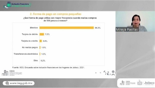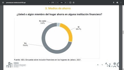 El Instituto de Información Estadística y Geográfica de Jalisco (IIEG) realizó la "Encuesta sobre inclusión financiera en los hogares de Jalisco", que mostraron números poco alentadores en cuestión de estrategias de ahorros formales, ya que aproximadamente dos de cada 10 jaliscienses cuentan con un mecanismo de ahorro.Además casi un 20% de la población confía en mecanismos informales de ahorro como tandas y rifas.Al respecto, Mireya Pasillas Torres, directora de Información Estadística Económica y Financiera del IIEG detalló las cifras de ahorro en la entidad."El 16.8% nos dijeron que sí utilizan un medio de ahorro como tanda o rifa, de este 14.7% es a veces y 2.1% de manera regular, de este tipo de mecanismo el 82.9% dice que no. También preguntamos de medios formales de ahorro, el 25.7% nos dijo que sí, el 70 % nos dijo que no", señaló la especialista.La "encuesta sobre inclusión financiera en los hogares de Jalisco" se levantó por teléfono del 1 al 3 de octubre del 2021 por parte del IIEG, a una muestra aleatoria efectiva de 457 hogares. Este tamaño de muestra implica un margen de error ±4.5% y un nivel de confianza del 95 por ciento.Los entrevistados fueron todos mayores de 18 años.Entre los temas que se abordaron en la encuesta telefónica fue:En el primer tema de quejas formales interpuestas ante una institución financiero solamente el 4.6% de la muestra recabada se ha quejado, mientras que un 94.9 % señaló que no.De quejas ante la Comisión Nacional para la Protección y Defensa de los Usuarios de Servicios Financieros (Condusef), solamente el 2.9% ha interpuesto un reclamo, mientras que el 96.2% no ha interpuesto queja.De las quejas interpuestas, el 51.9% son de cargos no reconocidos en tarjetas de débito o crédito; otro 18.5% de reclamos es por llamadas fraudulentas de personas que se hacen pasar por una institución bancaria; 11.1% por mala atención de la institución; 11.1% sobre que el cajero no le dio la cantidad correcta y 3.7% clonación de tarjetas.En el segundo tópico que trató IIEG en la encuesta de formas de pago utilizadas con mayor frecuencia cuando realiza compras de 500 pesos o menos, la muestra señala que el 86.3% utiliza efectivo, 7.2% tarjeta de débito, 3.6% tarjeta de crédito, 1.5% no realiza pagos y 1.3% transferencia electrónica.En otro apartado del tema de ahorro, las respuestas a la pregunta ¿Qué instrumento(s) o servicios(s) utiliza?, el 91% tienen un mecanismo formal financiero, el 91% tiene una cuenta de ahorro, 4.9% fondo de inversión, 3.3% pagarés, 0.8% Cetes y 2.5% otros.En cuanto productos financieros para el hogar, el 30.1% cuenta con tarjeta de tienda departamental; 6.7% de la muestra tiene un crédito de vivienda; 7.2% cuenta con algún crédito automotriz, 90.9% no usa ese tipo de crédito; además solamente el 17.5% tiene seguro de vida y el 80.4% no tiene este tipo de seguro.En el apartado de seguro de gastos médicos, solamente el 9.9% de la muestra cuenta con la protección de gastos médicos, mientras que el 88% no cuenta con este servicio; en seguro automotriz solamente el 26.3% tiene su vehículo asegurado, 72% no tiene seguro de auto.El último punto de la encuesta sobre la percepción de las comisiones que paga por el uso de los servicios financieros mencionados, para el 50.9% de la muestra las comisiones son altas, 16.7% adecuadas, 13.7% no paga comisiones, 9.6% muy altas.Para más detalles de la encuesta, puedes visualizar aquí los datos finalesGC