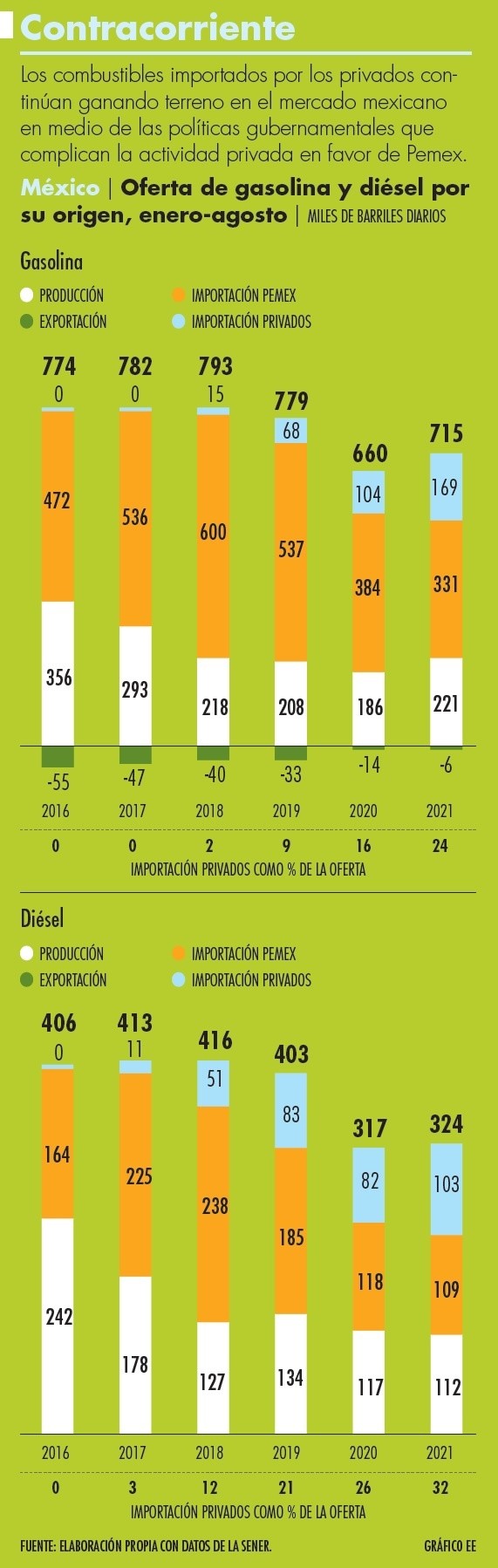 De enero a agosto de este año, uno de cada cuatro litros de gasolina vendida en el país y uno de cada tres litros de diésel fueron importados directamente por empresas privadas, participaciones que representan un nuevo máximo en momentos en los que nuevas políticas del gobierno mexicano han planteado serios desafíos para la continuidad de las importaciones privadas.Durante los primeros ocho meses del año, las importaciones de gasolina de permisionarios privados se incrementaron 62.6% a 169 mil 322 barriles diarios, con lo que elevaron su participación en la oferta total del carburante –calculada como la producción nacional más las importaciones menos las exportaciones– de 16 a 24% con relación al mismo lapso del 2020, de acuerdo con cálculos a partir de cifras reportadas por la Secretaría de Energía.En el caso del diésel, la internación de producto por parte de particulares se elevó 25.2% a 103 mil 240 barriles diarios en promedio, de modo que su participación en la oferta nacional del carburante pasó de 26 a 32 por ciento.Entre enero y agosto pasados, la oferta de gasolina se incrementó 8.4% a 715 mil 033 barriles diarios, aunque aún se encuentra 9.8% por debajo de su pico previo a la pandemia, registrado en el 2018. El 70% del combustible es importado.La oferta de diésel, por su parte, se elevó 2.2% a 323 mil 792 barriles diarios, cantidad que es 22.2% inerior a la del 2018. El 65% del carburante comercializado en el país es de origen importado.Este 2021 se cumplen cinco años de que se dio por terminado el monopolio de Petróleos Mexicanos (Pemex) en la producción, importación y comercialización de petrolíferos, lo que dio pie a que los privados pudieran obtener permisos de importación y desarrollaran infraestructura de transporte propia.El terreno ganado por los particulares es espacio perdido por Pemex, quien hasta el 2015 controlaba el 100% de la producción, importación y comercialización de producto y se trata de una tendencia que el presente gobierno ha tratado de revertir a través de modificaciones legales y reglamentarias.La primera fue la reforma a la Ley de Hidrocarburos aprobada por la mayoría senatorial de Morena el pasado 22 de abril y publicada en el Diario Oficial de la Federación (DOF) el 4 de mayo siguiente.Esta marca condiciones más restrictivas para que los privados obtengan permisos de importación y otorga libertades al Estado para que tome control de infraestructuras de despacho de particulares si considera que de ello depende la seguridad energética del país.Paralelamente, el Congreso avaló –también gracias a la mayoría morenista– modificar el artículo décimo tercero transitorio de la Ley de Hidrocarburos, para poner fin a la regulación asimétrica de la Comisión Reguladora de Energía (CRE) que busca limitar el poder de mercado de Pemex, por ser el agente económico preponderante.Ambas modificaciones se mantienen congeladas, ya que los tribunales especializados en competencia económica, telecomunicaciones y radiodifusión han otorgado suspensiones a una multitud de empresas que promovieron juicios de amparo, bajo el argumento de que los cambios a la Ley de Hidrocarburos van a contracorriente de la apertura de mercado en hidrocarburos que quedó consagrada en la Constitución, gracias a la reforma en materia energética del 2013-2014.El pasado 12 de junio, en lo que fue calificado como un nuevo intento del gobierno de socavar la apertura del mercado, el Servicio de Administración Tributaria (SAT) publicó cambios en las reglas de comercio exterior que prohíben que los permisionarios privados puedan importar producto en lugares distintos a las aduanas (terrestres, aéreas o marítimas), dejándole este privilegio únicamente a Pemex y a la Comisión Federal de Electricidad (CFE).En la práctica, los cambios en las reglas de comercio exterior dejarían inservibles instalaciones privadas como terminales de almacenamiento, puesto que ya no sería posible utilizarlas para recibir producto importado, lo que sólo podría hacerse en las aduanas.