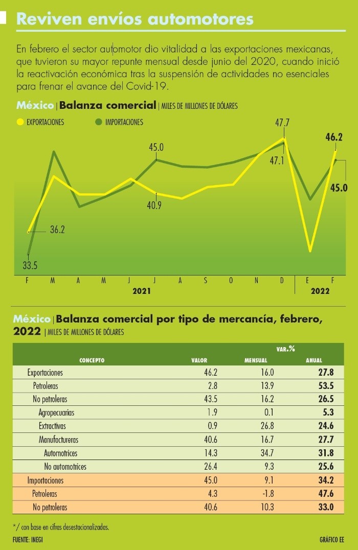 Las exportaciones mexicanas de mercancías totalizaron 46 mil 246 millones de dólares en febrero pasado, logrando un alza interanual de 27.8%, impulsada por la recuperación de las ventas automotrices, informó ayer el Instituto Nacional de Geografía y Estadística (Inegi).El crecimiento anual fue el más alto en los últimos seis meses, mientras que ese mismo resultado aumentó 16% a tasa intermensual con datos desestacionalizados, lo que significó su mejor desempeño en los últimos 20 meses.En particular, las exportaciones automotrices se incrementaron 31.8% año contra año, a 14 mil 251.9 millones de dólares, marcando un contraste puesto que este indicador registró una caída de 20.5% en enero pasado.De modo panorámico, el comercio internacional ha tenido interrupciones en la cadena de suministro causadas por la congestión portuaria en curso, junto con la escasez de equipos y mano de obra, como consecuencia de la pandemia, aunque con una tendencia a la baja en esa problemática, que incluye insuficiencia de chips semiconductores con afectaciones marcadas en la industria automotriz.Las importaciones de productos a México fueron de 44 mil 953.1 millones de dólares en febrero, un aumento de 34.2%, por lo que México obtuvo un superávit de mil 293 millones.Un análisis de Banorte indicó que el periodo típicamente es positivo para México debido a la aceleración de las manufacturas, mientras que las importaciones tienden a desacelerarse dado que los flujos desde China caen por la celebración de Año Nuevo Lunar.Según Banorte, las exportaciones e importaciones crecieron ayudadas en cierta medida por efectos base más favorables, en tanto que los rubros petroleros aún están creciendo a un ritmo más acelerado, impulsados por precios elevados.Mientras que las exportaciones petroleras avanzaron 53.5% (2 mil 794.5 millones de dólares), las no petroleras subieron 26.5% (43 mil 451.5 millones), a tasas anuales.Al interior de estas últimas, las agropecuarias se cifraron en mil 900.3 millones (+5.3%), las extractivas en 908.6 millones (+24.6%) y las manufactureras en 40 mil 642.5 millones (+27.7 por ciento).Dentro de las exportaciones manufactureras, los aumentos anuales más importantes se observaron en las exportaciones de productos de la siderurgia (80.6%), de maquinaria y equipo especial para industrias diversas (35.8%), de productos automotrices (31.8%), de alimentos, bebidas y tabaco (26%) y de equipos y aparatos eléctricos y electrónicos (21.7 por ciento).A su vez, el incremento anual de las exportaciones de productos automotrices fue resultado de avances de 27.2% en las ventas a Estados Unidos y de 54.3% en las dirigidas a otros mercados.Semiconductores: incertidumbre continuaráDentro de las exportaciones, Banorte destacó que los envíos del sector automotriz rebotaron con fuerza, aunque aún con volatilidad considerando la incertidumbre sobre la producción de semiconductores y otros problemas logísticos que han cobrado factura en el sector en meses recientes (por ejemplo, huelgas de transportistas en Canadá y aumento de costos).Al mismo tiempo, el valor de las exportaciones petroleras fue de 2 mil 795 millones de dólares. Este monto se integró por 2 mil 239 millones de dólares de ventas de petróleo crudo y por 556 millones de dólares de exportaciones de otros productos petroleros.En ese mes, el precio promedio de la mezcla mexicana de crudo de exportación se situó en 86.39 dólares por barril, cifra mayor en 10.65 dólares respecto a la del mes previo y en 30.42 dólares en comparación con febrero de 2021.En cuanto al volumen de crudo exportado, éste se ubicó en el mes de referencia en 0.925 millones de barriles diarios, nivel superior al de 0.832 millones de barriles diarios de enero, pero inferior al de 1.006 millones de barriles diarios de febrero de 2021.Las expansiones anuales más importantes en el sector agropecuario se registraron en las exportaciones de cítricos (76.1%), café crudo en grano (47.6%), fresas frescas (39.2%), aguacate (32.9%) y de frutas y frutos comestibles (16.2 por ciento).En contraste, las caídas anuales más relevantes se presentaron en las exportaciones de pimiento (37%) y de jitomate (17.3 por ciento).Al considerar las importaciones por tipo de bien, se observaron alzas anuales de 39.5% en las importaciones de bienes de consumo, de 35.8% en las de bienes de uso intermedio y de 12.6% en las de bienes de capital.En especial, los bienes de consumo hilaron seis meses al alza. Para Banorte, esto sugiere que la demanda doméstica continúa ganando ritmo –tal como se vio en la demanda agregada del cuarto trimestre de 2021. Así que el banco considera que cierta cautela es necesaria dado que el sesgo de precios puede ser más evidente en este sector. Las compras de productos petroleros disminuyeron, ayudando a explicar el mayor superávit total.