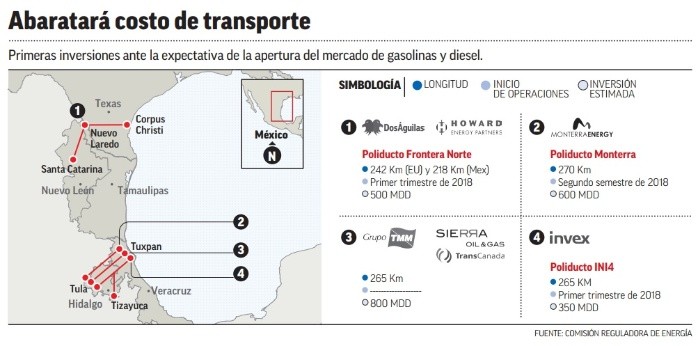En México se construyen cuatro ductos que utilizarán empresas privadas para ingresar al país gasolina barata, que vendría de las refinerías del sureste de Estados Unidos e incluso de otros países, como India. Entrarán en operación en la primera mitad de este año y tienen como finalidad acercar los principales puntos de internación de los combustibles a zonas como Monterrey, Ciudad de México y el Bajío. La inversión estimada para estos proyectos asciende a dos mil 300 millones de dólares, con base en información de la Comisión Reguladora de Energía (CRE), y bajarían el costo de transporte hasta seis veces respecto a ExxonMobil, hasta ahora el principal competidor privado de Pemex, que lo trae desde sus refinerías en Texas vía tren a sus terminales de almacenamiento en Guanajuato y San Luis Potosí. El primero en entrar en operación, de acuerdo con un documento en manos de El Financiero, será el Poliducto Frontera-Norte, que conectará al sistema de refinación de Corpus Christi, Texas, con Nuevo Laredo, Tamaulipas, y posteriormente bajará la gasolina, diésel y turbosina, hasta Monterrey. Tendrá una longitud total de 460 kilómetros y se acompaña de cuatro terminales de almacenamiento. El proyecto está a cargo del consorcio Dos Águilas y Howard Energy Partners, y requirió una inversión de 500 millones de dólares. Los otros tres proyectos están destinados a transportar gasolinas desde el puerto de Tuxpan, Veracruz, hacia la zona centro y bajío del país, con empresas detrás como TransCanada, y las firmas mexicanas Sierra Oil & Gas, Invex, Monterra Energy, entre otras. La CRE señaló que el costo promedio de transporte de las gasolinas en nuestro país es 13.6 por ciento del total, cifra que podría bajar con los ductos, toda vez que, señala la dependencia, transportarla por buquetanque cuesta dos veces más y por ferrocarril seis veces más que por ductos, mientras que el transporte por pipa es el más oneroso, pues cuesta 14 veces más. Arturo Carranza, analista en temas energéticos del Instituto Nacional de la Administración Pública (INAP), explicó que para que haya un impacto en el precio de los combustibles, los ductos tendrían que complementarse con terminales de almacenamiento. “Eso permitiría que privados bajaran gasolina desde EU y habría competencia con Pemex, esa competencia resultaría en menores precios”. Pero, la reducción en el precio no sería tan grande, “ya no tendríamos precios de 13 pesos por litro, por ejemplo”, dijo, pues se consideran además otros componentes en el precio de las gasolinas. Para Ramses Pech, de Caravia y Asociados, el impacto en precios dependerá de lo que estas firmas determinen que quieren ganar en sus planes de negocio, “el acero está subiendo, entonces no veo viable que impacte en el precio”.De acuerdo con las prospectivas de petrolíferos para 2031 de la Secretaría de Energía (Sener), el año pasado se importó 65 por ciento de las gasolinas que se consumieron en el país, cifra que bajaría a 54 por ciento este año por la entrada en operación de algunas etapas de las reconfiguraciones en las seis refinerías del país y que se mantendrá en 35 por ciento durante la próxima década. En este sentido, en los primeros once meses de 2017 se reportó el nivel más bajo de producción en las seis refinerías del país, con un promedio diario de 937 mil barriles diarios, señalan indicadores de Pemex Fin de TLCAN afectaría rondas petroleras Bill Richardson, secretario de Energía durante la presidencia de Bill Clinton, aseguró que la posible salida de EU del TLCAN afectaría a las rondas petroleras mexicanas. En el Foro Internacional de Energía México 2018, en Puebla, recordó que cuando se negoció la primera versión del TLCAN no se consideró al sector energético, pues la situación de la industria en México era otra y con la reforma energética, todo cambió. “Cuando dirigía la secretaría de Comercio en EU estuve involucrado en las negociaciones del tratado y no incluimos el sector energético; actualmente se necesita un libre mercado en dicho sector, de lo contrario afectará negativamente a los dos países”, dijo a El Financiero. Richardson es pesimista ante las posturas políticas de su país, pero coincidió en que el TLCAN requiere ser modernizado en el área energética para generar mayores beneficios laborales y ambientales en ambos países. “Pase lo que pase, EU seguirá invirtiendo en México, porque sigue creciendo a pesar de sus problemas de seguridad”.