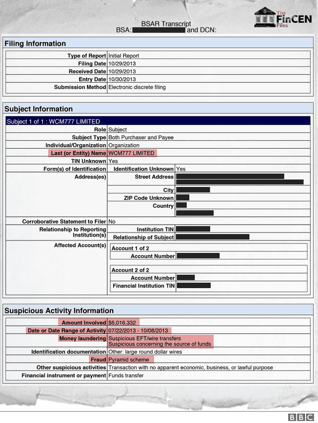 Documentos filtrados que dan cuenta de transacciones que suman unos US$2 billones revelan cómo algunos de los bancos más grandes del mundo han permitido que delincuentes y políticos corruptos muevan dinero sucio por todo el mundo.Se trata de los FinCEN Files, que incluyen más de 2,100 "reportes de actividades sospechosas" elaborados por bancos y otras instituciones financieras y enviados a la Red de Control de Delitos Financieros del Departamento del Tesoro de Estados Unidos (FinCEN, por sus siglas en inglés).Estos archivos confidenciales fueron obtenidos por el portal estadounidense de noticias BuzzFeed News, que los compartió con el Consorcio Internacional de Periodismo de Investigación (ICIJ, por sus siglas en inglés), la organización que coordinó también la investigación de los Panamá Papers.Y 400 periodistas de 108 medios de comunicación de 88 países -incluyendo el programa Panorama de la BBC- pasaron 16 meses tirando de los hilos que encontraron en esos archivos, analizando millones de transacciones bancarias, investigando registros judiciales y entrevistando a investigadores, víctimas y presuntos implicados.El resultado de esas investigaciones, que en palabras del ICIJ es "un verdadero tour mundial del crimen, la corrupción y la desigualdad, con papeles protagónicos para políticos, oligarcas y estafadores, y papeles clave de banqueros que les sirven a todos", empezará a ser publicado a partir de este domingo por los socios del consorcio.En América Latina estos incluyen a medios como Proceso, Quinto Elemento Lab y Mexicanos Contra la Corrupción y la Impunidad, en México; Perfil, Infobae y La Nación, en Argentina; Armando Info, en Venezuela; Connectas y El Espectador, en Colombia; Convoca, en Perú y LaBot, en Chile, entre otros.La mayoría de los documentos contenidos en los FinCEN Files son "reportes de actividades sospechosas" (SARs, por sus siglas en inglés) enviados a las autoridades estadounidenses entre 2000 y 2017.Estos documentos son algunos de los secretos mejor guardados del sistema bancario internacional y son utilizados por los bancos para informar sobre comportamientos sospechosos de sus clientes.Los SARs no necesariamente refieren a delitos ni constituyen prueba de delitos.Pero cualquier inquietud vinculada a transacciones realizadas en dólares estadounidenses debe notificarse al FinCEN, incluso si tiene lugar fuera de los EE.UU.Por eso, las repercusiones de las investigaciones derivadas de los FinCEN Files se harán sentir por todo el mundo."A partir de los archivos secretos, los periodistas rastrearon los dólares de un traficante de drogas de Rhode Island, EE.UU., hasta un laboratorio químico en Wuhan, China; exploraron escándalos que paralizaron las economías de África y Europa del Este; identificaron a saqueadores de tumbas con reliquias budistas que se vendieron a las galerías de Nueva York; y siguieron a magnates venezolanos que desviaron dinero de viviendas públicas y hospitales", dice el ICIJ sobre a algunas de las historias investigadas.El FinCEN, por su parte, dijo que la filtración podría afectar la seguridad nacional de Estados Unidos, comprometer las investigaciones y amenazar la seguridad de las instituciones y las personas que presentan los informes.Si alguien planea sacar provecho de una empresa criminal debe encontrar una forma para lavar el dinero.El lavado de dinero es el proceso de tomar dinero sucio -producto de delitos como el tráfico de drogas o la corrupción- y ponerlo en una cuenta en un banco respetado donde no estará vinculado con el delito.El mismo proceso es necesario si uno es un oligarca ruso al que los países occidentales han impuesto sanciones para evitar que ingrese su dinero a Occidente.Se supone que los bancos deben asegurarse de no ayudar a los clientes a lavar dinero o moverlo de manera contraria a las reglas.Por ley, tienen que saber quiénes son sus clientes. Y no es suficiente presentar un SAR y seguir recibiendo dinero sucio de los clientes mientras se espera que las autoridades se encarguen del problema: si un banco tiene evidencia de actividad criminal, debe dejar de mover el dinero.Fergus Shiel del Consorcio Internacional de Periodistas de Investigación (ICIJ), dijo que los archivos filtrados dan una "idea de lo que los bancos saben sobre el vasto flujo de dinero sucio en todo el mundo".Y según Shiel, los documentos también ponen en evidencia las cantidades extraordinariamente grandes de dinero involucradas.Los documentos en los FinCEN Files cubren alrededor de US$2 billones de transacciones, pero son solo una pequeña proporción de los SARs presentados durante el período.La filtración generará lecturas incómodas para algunos de los principales bancos del mundo.Estas son algunas de las revelaciones que estos seguramente preferirían haber mantenido fuera del conocimiento público.HSBC permitió a estafadores mover millones de dólares de dinero robado por todo el mundo, incluso después de enterarse por boca de investigadores estadounidenses de que era parte de una estafa.JP Morgan permitió que una empresa moviera más de US$1,000 millones a través de una cuenta de Londres sin saber quién era el propietario. Más tarde, el banco descubrió que la compañía podría ser propiedad de un mafioso en la lista de los 10 más buscados del FBI.Se encontró evidencia de que uno de los socios más cercanos del presidente de Rusia, Vladimir Putin, utilizó al Barclays Bank en Londres para evitar sanciones que estaban destinadas a impedir que usara los servicios financieros en Occidente. Parte del efectivo se utilizó para comprar obras de arte.El Banco Central de los Emiratos Árabes Unidos no actuó ante las advertencias sobre una empresa local que estaba ayudando a Irán a evadir sanciones.Deutsche Bank movió el dinero sucio de los lavadores de dinero para el crimen organizado, terroristas y narcotraficantes.Standard Chartered movió efectivo para Arab Bank durante más de una déca