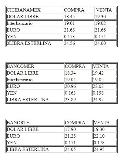 Esta mañana, el dólar estadounidense se ofrece hasta en 19.42 pesos, siete centavos más en comparación con el cierre de ayer, y se adquiere en un mínimo de 17.90 pesos en sucursales bancarias de la capital mexicana.De acuerdo con Banco Base el peso inicia la sesión con pocos cambios, debido a que hoy no se publicarán indicadores económicos en México, por lo que podría cotizar en función de indicadores y noticias del exterior, particularmente de Estados Unidos. Así, el mercado espera los datos preliminares de confianza del consumidor correspondientes a enero que, en caso de mostrar un deterioro respecto a diciembre, es probable que el dólar ceda terreno moderadamente. La institución financiera prevé que el tipo de cambio se cotice durante este viernes en un canal entre los 18.95 y los 19.15 pesos por dólar. El Banco de México (Banxico) informa en el Diario Oficial de la Federación (DOF) que el tipo de cambio para solventar operaciones denominadas en moneda extranjera pagaderas en el país se coloca en 19.0630 pesos. Asimismo, las Tasas de Interés Interbancarias de Equilibrio (TIIE) a 28 y 89 días se colocan en 8.5831 y 8.6080 por ciento, la primera con una pérdida de 0.0094 puntos porcentuales y la segunda sin cambios. OA