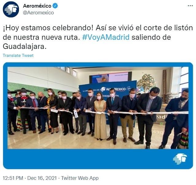 Este jueves fue inaugurado el primer vuelo Guadalajara-Madrid de Aeroméxico con la presencia de autoridades municipales, estatales, cancilleres y representantes de la aerolínea, el cual, dijeron, impulsará el turismo y la economía de nuestra Entidad.Fue la madrugada de este jueves cuando llegó a Guadalajara el vuelo vuelo AM39 MAD/GDL, el cual arribó al aeropuerto tapatío con una ocupación del 90% y por la mañana el mismo vuelo partió con destino a la capital española, informó Giancarlo Mulinelli, vicepresidente de ventas Aeroméxico.“Por muchos años, pasajeros que originaban en Guadalajara e iban a Madrid, su trayectoria estaba en promedio de 15 a 20 horas. Hoy los pasajeros que estarán abordando en el Aeropuerto de Guadalajara estarán llegando a Madrid en 10 horas y 35 minutos”, destacó Mulinelli durante el evento realizado esta mañana en la terminal aérea.El director General del Grupo Aeroportuario del Pacífico, Raúl Revuelta, se dijo gustoso de la puesta en marcha de esta nueva ruta que había sido buscada desde hace muchos años, la cual favorecerá el turismo y el intercambio cultural entre Guadalajara y Madrid.Por su parte, la secretaria de Turismo de Jalisco, Vanessa Pérez, indicó que la inauguración de este vuelo quedará plasmada en la historia de Jalisco, debido a que no solo se abre una nueva ruta turística, sino un nuevo camino para impulsar el crecimiento económico, turístico, cultural y social del Estado.“Jalisco está listo para recibir a las y los turistas europeos con atractivos y experiencias únicos para diversos segmentos, con nuestro mariachi, el tequila, la raicilla y la calidez de nuestra gente, siempre respetando los protocolos sanitarios mientras sigan vigentes. Estoy segura de que este vuelo será todo un éxito”, añadió la secretaria.Con ello, añadió, se impulsará una estrategia para dar a conocer este vuelo, resultado del esfuerzo compartido entre el Gobierno jalisciense, la Oficina de Convenciones y Visitantes del Estado, el Grupo Aeroportuario del Pacífico y Aeroméxico.El alcalde de Tlajomulco, Salvador Zamora, señaló que gracias al crecimiento del Aeropuerto de Guadalajara se ha beneficiado también la recuperación económica del Estado, especialmente de Tlajomulco, municipio que alberga esta terminal aérea, mientras que el coordinador de de Crecimiento y Desarrollo Económico, Xavier Orendain, deseó todo el éxito a esta nueva ruta para que en un futuro cercano tenga salidas cada vez más próximas, pues hasta ahora se prevé solo un vuelo por semana entre ambas ciudades.Entre las personalidades que estuvieron presentes corte del listón también se encontraron el presidente de la Oficina de Visitantes y Convenciones de Guadalajara, Carlos Wolstein; Miguel Ángel Fong de la Asociación de Hoteles de Jalisco; el Director del Aeropuerto Internacional de Guadalajara, Martín Zazueta y la piloto de Aeroméxico, Ana Carolina.AF