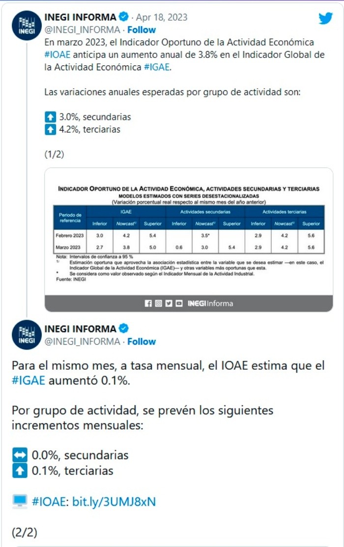 La economía mexicana se habría desacelerado en marzo pasado, pese a ello se anticipa un buen resultado para el Producto Interno Bruto (PIB) del primer trimestre del año, revelan las proyecciones más recientes del Instituto Nacional de Estadística y Geografía (Inegi).El Indicador Oportuno de la Actividad Económica (IOAE) prevé que el Indicador Global de la Actividad Económica (IGAE) tuvo un crecimiento mensual de apenas 0.1% en marzo de 2023, luego de que en febrero había alcanzado un alza de 0.7 por ciento.Utilizando el IGAE de enero y estos estimados, el PIB del primer trimestre del año habría avanzado alrededor de 1.4% respecto al periodo inmediato anterior, estiman analistas de Banorte.Esto representa una aceleración respecto al cuarto trimestre de 2022, cuando creció 0.5%, lo que apoya la visión de los especialistas de un buen dinamismo de la economía mexicana al inicio del año, apoyada por fundamentales positivos e inclusive a pesar de cierta incertidumbre en las condiciones externas.Este menor dinamismo de la economía en marzo es resultado del estancamiento de la actividad industrial durante el tercer mes del año, después de que en febrero reportó un aumento de 0.7%, y en enero un retroceso de 0.1 por ciento.Por su parte, el sector servicios habría observado un crecimiento estimado mensual de 0.6% en febrero pasado y de 0.1% en marzo de 2023, pese al dinamismo de la inflación.De esta forma y a tasa anual, el IOAE anticipa para el tercer mes de 2023 un aumento de 3.8% de la actividad económica del país, con base en cifras desestacionalizadas. La variación anual esperada de las actividades industriales sería un incremento de 3.0% y del sector servicios de 4.2%, para el periodo de referencia.El IOAE permite contar con estimaciones oportunas sobre la evolución del IGAE. Así, mientras que el IGAE y sus actividades económicas se dan a conocer aproximadamente ocho semanas después de terminado el mes de referencia, el IOAE presenta sus estimaciones apenas tres semanas después del cierre del mes. Con esto, se adelanta cinco semanas a la publicación de los datos oficiales, explicó el Inegi en su comunicado.JM