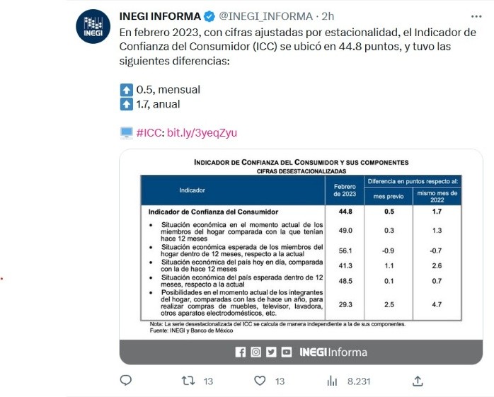 El índice de confianza del consumidor (ICC) mexicano aumentó 0.5 puntos en febrero frente al mes anterior hasta llegar a los 44.8, reveló este martes el Instituto Nacional de Estadística y Geografía (Inegi) con cifras ajustadas por estacionalidad.Frente al mismo mes de 2022 el ICC, elaborado de manera conjunta por el Inegi y el Banco de México, subió 1.7 puntos.El ICC tuvo incrementos mensuales en cuatro de los cinco componentes que lo integran, pero una contracción mensual de 0.9 puntos y una anual de 0.7 en el indicador de "situación económica esperada de los miembros del hogar dentro de 12 meses, respecto a la actual".El factor que registra una mayor subida es el de "posibilidades en el momento actual de los integrantes del hogar, comparadas con las de hace un año, para realizar compras de muebles, televisor, lavadora, otros aparatos electrodomésticos, etc.", con un aumento mensual de 2.5 puntos y uno anual de 4.7.Le siguió la "situación económica del país hoy en día, comparada con la de hace 12 meses", que se incrementó en 1.1 puntos en el mes y 2.6 en el año.Mientras que la "situación económica en el momento actual de los miembros del hogar comparada con la que tenían hace 12 meses" tuvo una subida mensual de 0.3 puntos y una anual de 1.3.Y, por último, la "situación económica del país esperada dentro de 12 meses, respecto a la actual" se elevó en 0.1 puntos mes contra mes y en 0.7 año contra año.Estos datos se producen en medio de la aceleración de la inflación en México, que registró una tasa anual de 7.91 % en enero, la mayor para un inicio de año de las últimas dos décadas.También se difunden tras revelarse el martes que el Producto Interno Bruto (PIB) de México creció un 3.1 % en 2022 impulsado por todos los sectores y por encima de las expectativas.JM