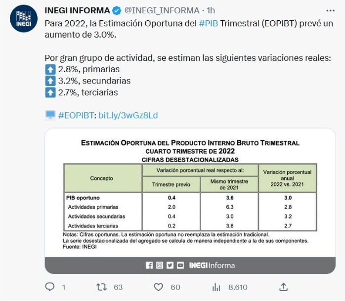 El Inegi añadió que en el cuarto trimestre de 2022, la economía mexicana creció 3.6% a tasa interanual y 0.4% respecto al trimestre inmediato anterior.