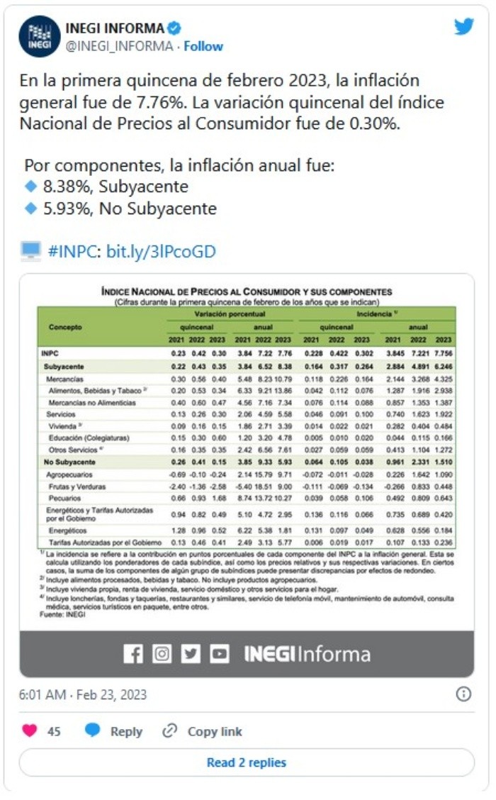 La tasa de inflación general mexicana descendió en la primera quincena de febrero hasta el 7.76 % anual, informó este jueves el Instituto Nacional de Estadística y Geografía (Inegi).El dato rompe con dos meses de incrementos consecutivos, tras el índice de 7.91 % de todo enero y el de 7.82 % de diciembre pasado, cuando la inflación tuvo su mayor cierre anual en 22 años y lo que va del siglo.Aún así, el Inegi reportó un incremento de 0.30 % en el Índice de Precios al Consumidor (IPC) respecto a los 15 días anteriores.El Inegi recordó que en la misma quincena de 2022, hace un año, la inflación quincenal fue de 0.42 % y la anual de 7.22 por ciento.El índice de precios subyacente, considerado un mejor parámetro para medir la carestía general porque elimina artículos de alta volatilidad en sus precios, aumentó un 0.35 % quincenal y un 8.38 % anual, detalló el Inegi en su reporte; asimismo, la partida de no subyacentes subió un 0.15 % a tasa quincenal y un 5.93 % interanual.Dentro del subgrupo de subyacentes, las mercancías aumentaron el 0.40 % en la quincena y un 10.79 % en el año, mientras que los servicios avanzaron un 0.3 % quincenal y un 5.58 % anual.En los no subyacentes, los precios de los agropecuarios decrecieron un 0.24 % respecto al periodo inmediato anterior, pero se elevaron un 9.71 % frente al mismo lapso del año pasado; en tanto, los energéticos y tarifas autorizadas por el Gobierno se incrementaron en 0.49 % en la quincena y en 2.95 % en el año.El índice de precios de la canasta básica, conformada por 176 productos y servicios, escaló un 0.3 % quincenal y un 8.28 % a tasa anual.Los precios al consumidor cerraron 2022 con una subida del 7.82 %, por encima del 7.36 % de 2021, que entonces fue el mayor nivel en los últimos 20 años.JM