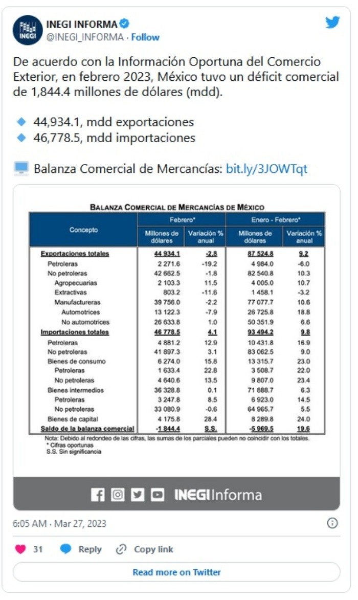 México tuvo en febrero pasado un déficit comercial de mil 844 millones de dólares con caídas en las exportaciones, informó este lunes el Instituto Nacional de Estadística y Geografía (Inegi).La cifra negativa se compara con el superávit de mil 286 millones de dólares de febrero de 2022 aunque es un déficit menor al de cuatro mil 125 millones de dólares de enero pasado, según recordó el organismo autónomo en su reporte.De esta forma, México acumula un déficit comercial de cinco mil 969.5 millones de dólares en lo que va de 2023, un aumento interanual de casi 20 por ciento.Tan solo en febrero, las exportaciones totales sumaron 44 mil 934.1 millones de dólares, un monto inferior en 2.8 % al del mismo periodo del año pasado, precisó el organismo con base en cifras originales.Las ventas petroleras decrecieron un 19.2 % interanual y se situaron en dos mil 271.6 millones de dólares, mientras que las no petroleras se redujeron un 1.8 % hasta los 42 mil 662.5 millones de dólares, detalló."Al interior de las exportaciones no petroleras, las dirigidas a Estados Unidos crecieron, a tasa anual, 2.2 % y las canalizadas al resto del mundo descendieron 17.8 %", ahondó el Inegi.En contraste, las importaciones totalizaron 46 mil 778.5 millones de dólares, un 4.1 % más que la cantidad reportada en el mismo mes del pasado año.Las compras petroleras crecieron un 12.9 % año contra año, al ubicarse en cuatro mil 881.2 millones de dólares, mientras que las no petroleras aumentaron un 3.1 % al sumar 41 mil 897.3 millones de dólares."Al considerar las importaciones por tipo de bien, se registraron incrementos anuales de 15.8 % en las importaciones de bienes de consumo, de 0.1 % en las de bienes de uso intermedio y de 28.4 %, en las de bienes de capital", detalló el Inegi.JM