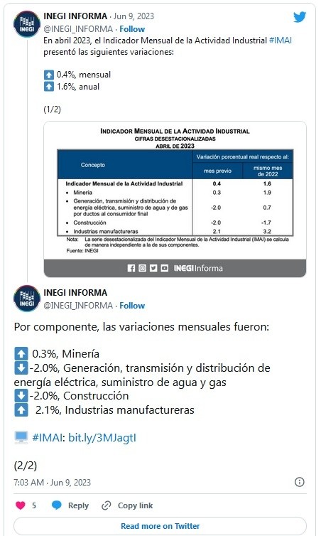 La producción industrial en México creció un 0.7 % interanual en abril impulsada en particular por las minas, informó este viernes el Instituto Nacional de Estadística y Geografía (Inegi).El dato fue resultado del alza interanual, con base en cifras originales, de la minería (1.9 %); las manufacturas (1.4 %), y la generación, transmisión y distribución de energía eléctrica y suministro de agua y gas (0.6 %), aunque hubo un retroceso en la construcción (-2 por ciento).De esta manera, en el primer cuatrimestre de 2023 la producción industrial de México creció un 2 % interanual. Esto es producto de subidas en la generación de electricidad y suministro de agua y gas (3.3 %), la manufactura (2.4 %), la minería (1.8 %), y la construcción (1 por ciento).Por otro lado, el indicador mensual de la actividad industrial (IMAI) se elevó un 0.4 %, en términos reales y con cifras desestacionalizadas, en abril pasado frente al mes anterior.Esto por los avances mensuales en la manufactura (2.1 %) y la minería (0.3 por ciento).En contraste, hubo caídas mensuales en la generación de energía eléctrica y suministro de agua y de gas (-2 %) y la construcción (-2 por ciento).Las cifras reflejan el comportamiento de la economía de México, cuyo producto interno bruto (PIB) creció un 3.7 % interanual y un 1 % trimestral en el primer trimestre de 2023, según las cifras definitivas del Inegi.La producción industrial en México aumentó un 3.3 % anual en 2022, en particular por las manufacturas y con incrementos en todos los sectores. JM