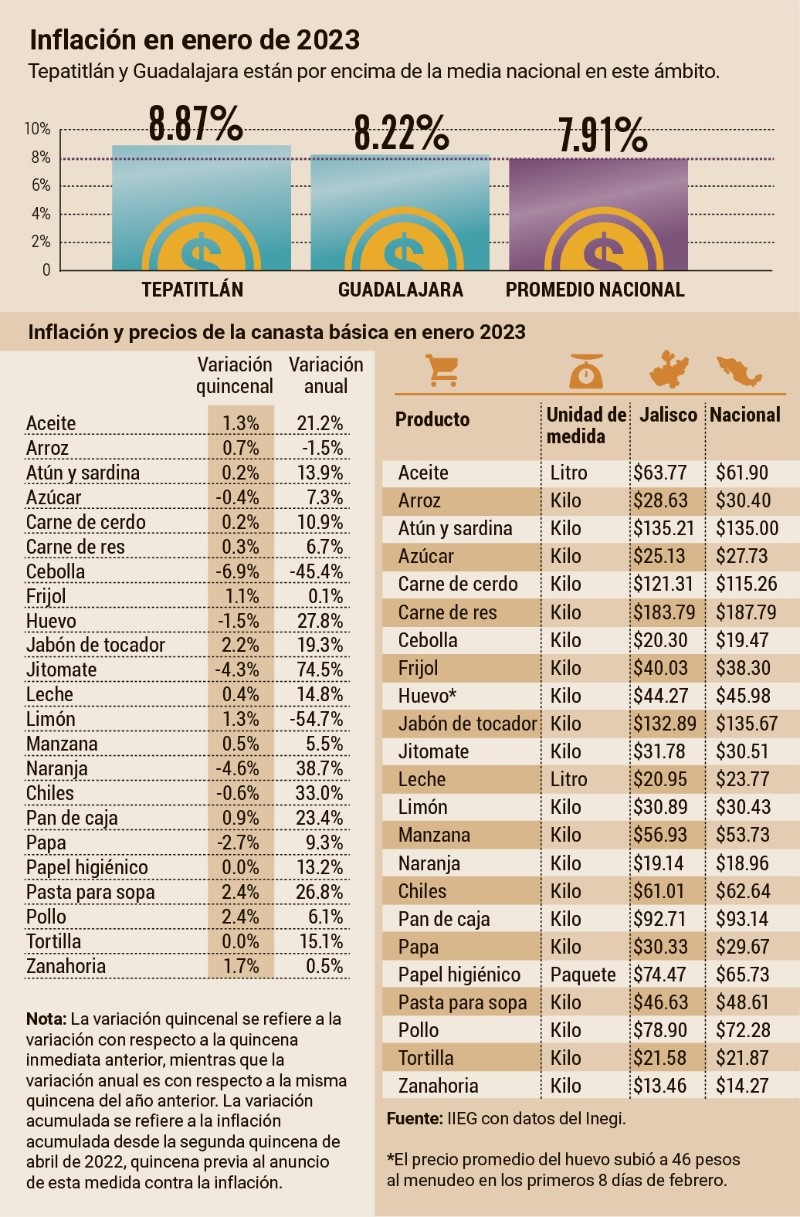 El Gobierno federal presentó, en mayo de 2022, el Paquete Contra la Inflación y la Carestía (PACIC) con el objetivo de contrarrestar el aumento de los precios de productos de la canasta básica a través de distintas estrategias.Sin embargo, en el monitoreo que se llevó a cabo en la segunda quincena de enero de este año, se destacó que 10 de los 23 productos incluidos en la lista se venden en Jalisco a un precio por arriba del promedio nacional: aceites y grasas vegetales comestibles, atún y sardina en lata, carne de cerdo, frijol, jitomate, limón, manzana, naranja, papa y otros tubérculos y pollo. Por otra parte, en el Índice Nacional de Precios al Consumidor (INPC), que toma en cuenta 299 productos, se resaltó el incremento de costos en ropa, calzado, accesorios, vivienda y salud. En esta revisión se destacó que los productos con alzas constantes durante el último año y medio en Jalisco debido a la inflación fueron: manteca de cerdo, tostadas, leche pasteurizada, seguro de automóvil, restaurantes y similares, renta de vivienda, pan dulce y queso fresco, entre otros. En enero de 2023 Guadalajara se posicionó en el lugar 31 de 55 ciudades con mayor inflación, con dos meses consecutivos siendo mayor que la media nacional. Mientras que en el caso de Tepatitlán, se ubicó en el sitio 15 con una inflación de 8.87%, porcentaje mayor al observado en el mes anterior.Por Entidad federativa, Jalisco se encuentra en el decimosexto lugar de las entidades con mayor incremento en los precios. Yucatán fue la que registró el mayor aumento a tasa anual, mientras que Sonora es la que presentó la menor variación a tasa anual. Un total de 22 Estados se encuentran por arriba de la inflación nacional.De acuerdo con el Gobierno de México, el aumento de la inflación, “además de dañar el poder adquisitivo de la moneda, hace más riesgosos los proyectos de inversión, afecta las decisiones de consumo y ahorro de las personas y propicia la desigualdad en la distribución del ingreso, entre otras consecuencias. En México, los estándares de estabilidad macroeconómica consideran que un nivel de inflación de 3% se encuentra dentro de márgenes costeables”. La Procuraduría Federal del Consumidor (Profeco) tiene la herramienta Quién es Quién en los Precios, la cual muestra los precios mínimos y máximos de un producto en distintas tiendas. Actualmente tiene la opción de agregar a los municipios de la metrópoli. Explica que la información, que se actualiza todos los días hábiles, incluye los precios de abarrotes, carnes, lácteos, frutas, verduras, aparatos electrodomésticos, línea blanca y medicamentos.“En temporadas especiales, como cuaresma, regreso a clases y fin de año, también se recopilan los precios de mil 600 productos adicionales, como pescados, mariscos, útiles escolares, uniformes, vinos y juguetes, entre otros”. Esta información se consulta en la página oficial de la Profeco. En el anuncio del pasado 9 de febrero sobre el incremento de 50 puntos base el objetivo para la tasa de interés interbancaria a un día, el Banco de México (Banxico) explicó que las perspectivas para 2023 siguen apuntando a una desaceleración.“La inflación global permanece elevada, si bien la general disminuyó en un amplio número de economías ante menores presiones en los precios de energéticos. La mayoría de los bancos centrales, incluida la Reserva Federal de Estados Unidos, continuó incrementando sus tasas de referencia y anunció que dichas tasas permanecerán elevadas por un periodo prolongado. Entre los riesgos globales destacan los asociados a la pandemia, la prolongación de las presiones inflacionarias, el agravamiento de las tensiones geopolíticas y condiciones monetarias y financieras más apretadas”.En ese sentido, se destacó que ante un proceso de desinflación más lento de lo previsto, los pronósticos para las inflaciones general y subyacente se ajustaron al alza para todo el horizonte. “Se anticipa que la inflación converja a la meta en el cuarto trimestre de 2024”.Según la “Encuesta sobre las Expectativas de los Especialistas en Economía del Sector Privado: Enero de 2023”, realizada por el Banco de México (Banxico), la previsión de inflación general y subyacente para el cierre de 2023 aumentaron con respecto a la encuesta de diciembre, al tiempo que las correspondientes al cierre de 2024 se mantuvieron en niveles similares. Esto significa que ahora consideran que este año terminará con una inflación general de 5.19%, pero el siguiente año disminuiría a 3.98 por ciento. Jorge Romero, coordinador del Partido Acción Nacional en la Cámara de Diputados, recordó que recientemente su bancada propuso un Plan de Emergencia Contra la Inflación, por lo que invitó a las distintas bancadas en la Cámara de Diputados, incluida la de Morena, a respaldar la propuesta.En el proyecto contempla la creación de un fondo para apoyar a las familias cuando la inflación supere 7%, así como disminución en el cobro de impuestos para los combustibles y la reducción en las tarifas de energía eléctrica.Denunció que la inflación en este sexenio es la más alta registrada desde hace más de 20 años. Herrera apuntó que dicha propuesta podría ser de gran utilidad en contextos como el actual, con la inflación a punto de rebasar nuevamente el 8%, y así ayudar a las familias que menos tienen.El UniversalCT