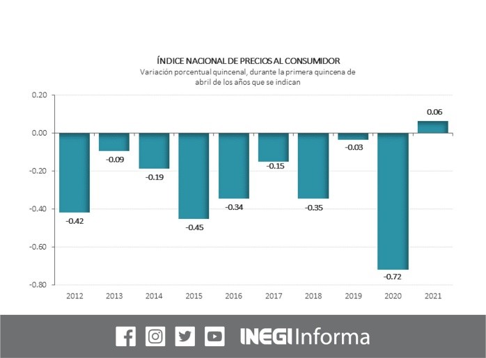 Este jueves, el Instituto Nacional de Estadística y Geografía (Inegi) informó que la inflación se disparó a su mayor nivel en más de tres años en la primera quincena de abril, producto del efecto aritmético que provoca una baja base de comparación del año pasado y por presiones en los precios de mercancías y frutas y verduras. El Índice Nacional de Precios al Consumidor (INPC) registró una inflación mínima de 0.06% respecto a la quincena inmediata anterior; pese a lo anterior la inflación anual se ubicó en 6.05%, debido a la menor base de comparación de un año antes, con lo que se ubica en el nivel más alto desde diciembre de 2017.En opinión de los especialistas, este repunte inflacionario reduce la ventana de oportunidad para que Banco de México (Banxico) retome su ciclo de recortes de la tasa de referencia en el corto plazo.Entre los bienes y servicios cuya alza de precios incidió más en la inflación, destacan: el jitomate con un incremento quincenal de 18.84%; aguacate, 15.74%; loncherías, fondas, torterías y taquerías, 0.45%; chile serrano, 25.13%; tortilla de maíz, 0.89%; pollo, 0.59%; automóviles, 0.47%; tomate verde, 7.36%; otros chiles frescos, 10.19%; y vivienda propia, 0.08%.Por el contrario, los genéricos cuya baja de precios contribuyeron más a contener la inflación, fueron: electricidad con una disminución de 12.03%; papa y otros tubérculos, -8.88%; servicios turísticos en paquete, -7.20%; gas doméstico LP, -0.37%; transporte aéreo, -4.15%; cerveza, -0.33%; calabacita, -4.36%; chayote, -5.32%; otros alimentos cocinados, -0.25%; suavizantes y limpiadores, -0.88%.El índice de precios subyacente, que no incluye los bienes y servicios cuyos precios son más volátiles, tuvo un aumento de 0.18% quincenal y de 4.13% anual; por su parte, el índice de precios no subyacente presentó una disminución quincenal de 0.28% y un incremento de 12.21% anual.Al interior del índice de precios subyacente, a tasa quincenal, los precios de las mercancías crecieron 0.29% y los de los servicios 0.06%.Dentro del índice de precios no subyacente, los precios de los productos agropecuarios subieron 1.60% quincenal, mientras que los de los energéticos y tarifas autorizadas por el gobierno bajaron 1.61% quincenal, como resultado de los ajustes en las tarifas eléctricas dentro del esquema de temporada cálida en 18 ciudades del país.NR
