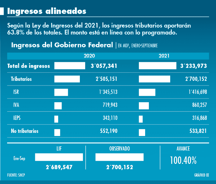 Los ingresos tributarios del gobierno sumaron 2.70 billones de pesos al cierre de septiembre, un aumento de 2.5% respecto al mismo periodo del 2020, de los cuales 735 mil 243 millones de pesos provinieron de las aduanas, con lo que se cumple la premisa del gobierno de combatir la corrupción en estos recintos, con la creación de la nueva Agencia Nacional de AduanasAl presentar cifras preliminares a septiembre, el Servicio de Administración Tributaria (SAT) informó que los ingresos tributarios cuentan con un avance de 100.4% con respecto al avance recaudatorio esperado para el periodo enero-septiembre. Para todo el año se prevén ingresos totales por 3.3 billones de pesos.El SAT reportó que el Impuesto sobre la Renta fue el que más recaudó, con 1.4 billones de pesos, una variación anual de 0.1% real. El Impuesto al Valor Agregado (IVA) captó 860 mil 257 millones de pesos, un aumento de 13.6% anual.Dentro de los tres grandes gravámenes, el Impuesto Especial sobre Producción y Servicios (IEPS) registró una caída anual en la recaudación de 12.2%, al pasar de 343 mil 110 a 316 mil 868 millones de pesos.Dentro del informe se detalla que los ingresos totales del gobierno a septiembre suman 3.2 billones de pesos, un avance de 0.6% real, frente a lo captado por el erario al cierre del tercer trimestre del año pasado.Aduanas recauda másLa recaudación vía aduanas registró una recaudación de 735 mil 243 millones de pesos, un alza real de 10.9% real o 104 mil 259 millones de pesos más respecto al mismo periodo del 2020.El IVA aportó 552 mil 795 millones y el IEPS 129 mil 062 millones de pesos un a caída de 21.5%, afectado por el IEPS por combustibles automotrices que se contrajo 22.8% real, debido a un aumento en el estímulo otorgado a este impuesto, donde el costo estimado se incrementó en alrededor de 36 mil 200 millones de pesos respecto al mismo periodo de 2020.Esfuerzos adicionales dejan 392 mil 633 MDP extraEn este sentido, el fisco mexicano detalló que en los primeros nueve meses del año, los esfuerzos adicionales de recaudación alcanzaron un monto de 392 mil 633 millones de pesos, de los cuales 52% (unos 205 mil 910 millones de pesos) corresponden a ingresos en efectivo.De tal manera que mediante los esfuerzos adicionales implementados por el SAT a los grandes contribuyentes se les ha podido cobrar más de 143 mil 740 millones de pesos.Mediante la eficiencia en la fiscalización se han captado más 105mil 972 millones de pesos; en relación con las mejoras implementadas al Comercio Exterior, 47 mil 411 millones de pesos y, finalmente, en la eficacia recaudatoria 95 mil 511 millones.En lo que respecta a la eficacia recaudatoria, el SAT detalló que el monto se debe a la implementación del Programa de Cumplimiento de Obligaciones y del Programa de Caídas Recaudatorias, así como a la cobranza coactiva.Estrategias en fiscalizaciónDe igual forma, a través de la implementación de mejores estrategias de cobranza y fiscalización, sin la necesidad de ir a juicio, de enero-septiembre se obtuvieron ingresos adicionales por 297 mil 122 millones de pesos, reveló el organismo desconcentrado.De dicho monto, 143 mil 740 millones de pesos provinieron de los grandes contribuyentes; 105 mil 972 mediante la fiscalización; y 47 mil 411 de la estrategia en comercio exterior.