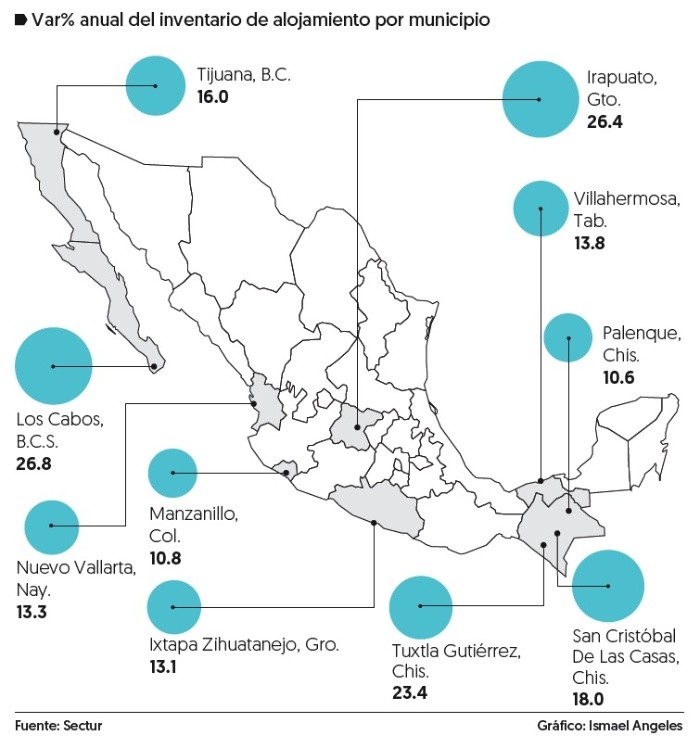 Ni la incertidumbre por la llegada de Donald Trump a la presidencia de Estados Unidos, ni el crecimiento de la inseguridad en México impidieron que los empresarios hoteleros aceleraran inversiones en el país. En los primeros nueve meses de 2017 la Inversión Extranjera Directa (IED) en el sector de servicios de alojamiento temporal ascendió a 689 millones de dólares, lo que representó un aumento de 67 por ciento respecto al mismo periodo de un año antes y el mayor incremento para un lapso igual desde 2012. Esto se reflejó en una expansión de 27 por ciento en la oferta de habitaciones en Los Cabos –al alcanzar casi los 16 mil cuartos de hotel, en su mayoría de lujo–, seguido de un alza de 26 por ciento en Irapuato, para llegar a los 2 mil 245 cuartos, y de 23% en Tuxtla Gutiérrez, donde se llegó a las 4 mil 341 llaves. Hoteleros, representantes y especialistas del sector opinan que la llegada de mayor IED obedece a la confianza que da a los inversionistas el crecimiento de las economías de México y EU, así como un panorama de mayor seguridad que el actual en el mediano plazo, lo que desencadenarían más viajes hacia, desde y dentro del país. A esto se suma el hecho de que México recibió 39.3 millones de turistas extranjeros en 2017, 12% más frente a 2016, el mayor incremento desde 2014, de acuerdo con datos del Banco de México. Además, el arribo de inversión en los sectores energético, automotor y agroindustrial, también demandó una mayor construcción de hoteles. “La inversión extranjera en el sexenio ronda cerca de los 157 mil millones de dólares, es un crecimiento de más del 50 por ciento en comparación con el sexenio anterior, con eso se generan corredores de inversión importantes, al grado de tener estados que crecen a niveles de países que son potencia mundial como Querétaro, San Luis Potosí, Aguascalientes”, dijo Gerardo Corona, subsecretario de Innovación y Desarrollo Turístico de la Sectur. “Cuando hay crecimiento llegan inversiones de sectores como el aeroespacial, el automotriz, el energético, el agroindustrial y este tipo de inversiones van desarrollando la necesidad de infraestructura hotelera”, agregó. Según el Semáforo Delictivo elaborado por la consultora RRS y Asociados con datos del Secretariado Ejecutivo del Sistema Nacional de Seguridad Pública, los homicidios en Baja California Sur habían crecido a diciembre del año pasado 192%; en Quintana Roo 118%; en Sinaloa 39%, y en Jalisco 19%. Sin embargo, Luis Barrios, presidente de la Asociación Nacional de Cadenas de Hoteles (ANCH), dijo que la inseguridad no frenó la inversión, debido a otros factores como el desempeño económico del país. “La inseguridad inhibe la inversión y el tránsito de personas, nadie quiere tomar riesgos, pero pese a eso, del cambio en la presidencia de EU y otros efectos como fue el Brexit, México aún tiene récord en exportación de autos, remesas y un desempleo bajo. “La economía crece, tenemos que incorporar a más personas al trabajo formal y si ese aumento se reduce, lo que continúa es forzar el mejoramiento del poder adquisitivo de nuestra gente mediante el incremento del salario. Eso significará una cadena virtuosa de más salario, más empleo, mayor masa salarial, más consumo, más fábricas y más carreteras, nuestros fundamentales en el negocio hotelero”, destacó. La ANCH tiene entre sus socios a Marriott, que conformó a la firma más grande del sector con la compra de Starwood, Barceló, Four Seasons y Melia, entre otros. Rafael García, presidente de la Asociación Mexicana de Hoteles y Moteles (AMHM), aseguró que si no se hubiera observado una expansión en la oferta de habitaciones, el alza de precios en los servicios hoteleros habría sido mayor en 2017. Según el Índice de Precios al Consumidor del INEGI, el servicio de hoteles observó una inflación de 7.2 por ciento en 2017, similar a la general de 6.77 por ciento. “México es un mercado en crecimiento sostenido de turismo aun y cuando vienen 9 por ciento más viajeros internacionales y somos ya el octavo país preferido por esos visitantes foráneos”, agregó García. Gerardo Corona, de la Sectur, añadió que para 2018 percibe un crecimiento sostenido en playas y ciudades. “La Riviera Maya trae un proyecto de 30 mil llaves hoteleras a construirse en los próximos dos años y medio. Hay líneas aéreas, crecimiento en financiamiento, carreteras y aeropuertos, desarrollos que permiten a los inversionistas confiar en México”, comentó. Estos fueron los principales destinos de la República Mexicana que más crecieron en oferta de habitaciones durante 2017.