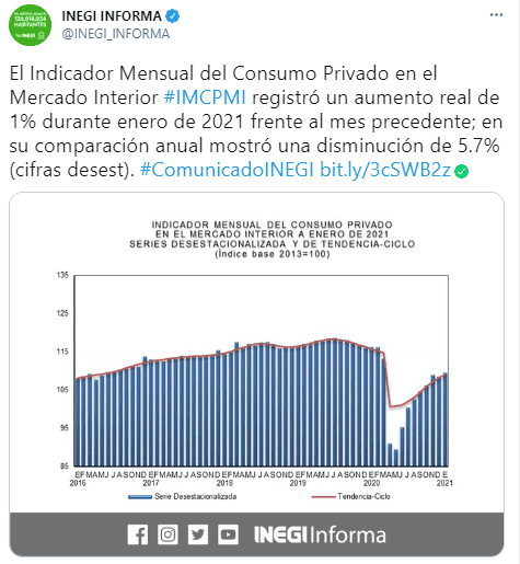 La inversión y el consumo privado, principales motores económicos de México, iniciaron 2021 con un avance mensual luego de haber cerrado el año pasado con un retroceso, informó el Instituto Nacional de Estadística y Geografía (Inegi).Los datos más recientes dados a conocer por el Inegi revelan que la inversión fija bruta, que representa los gastos realizados en construcción y en maquinaria y equipo de origen nacional e importado, registró un aumento en términos reales de 3.3% durante enero de 2021 respecto al mes inmediato anterior."El resultado sorprendió al alza, pues enero fue un mes de baja actividad económica ante el restablecimiento de medidas para evitar la propagación del COVID-19. Para ponerlo en contexto, esta es la variación más elevada en los últimos cinco meses y la tercera mayor en los últimos dos años, por lo que el dato contribuye a despejar los temores de un estancamiento prolongado en niveles muy inferiores a los del pasado reciente", comentó Daniel Arias, analista económico de Monex.El resultado se da tras una caída de 1.6% mensual y, además del efecto rebote, recibió un fuerte impulso del sector público a través de la inversión no residencial, que con un alza de 7.4% tuvo su mayor aumento desde 2010.Por componentes, los gastos efectuados en maquinaria y equipo crecieron 4.2% y en construcción ascendieron 2.9% en el primer mes de este año frente al mes precedente, según datos ajustados por estacionalidad.En su comparación anual, la inversión fija bruta disminuyó 9.6% en términos reales en el mes en cuestión. En su interior, los gastos en construcción fueron menores en 11.7% y en maquinaria y equipo descendieron 5% con relación a los de igual mes de 2020.Por su parte, el indicador mensual del consumo privado en el mercado interior registró un aumento real de 1% durante enero del presente año frente al mes inmediato anterior, con base en cifras ajustadas por estacionalidad.Este indicador mide el comportamiento del gasto realizado por los hogares residentes del país en bienes y servicios de consumo, tanto de origen nacional como importado; quedan excluidas las compras de viviendas u objetos valiosos.Por componentes, el consumo en bienes de origen importado se incrementó 7.6% y en bienes y servicios de origen nacional ascendió 0.5% en el primer mes de 2021 respecto al mes previo.En su comparación anual, el indicador mensual del consumo privado en el mercado interior mostró una disminución de 5.7% en el mes de referencia.A su interior, la reducción en los gastos en bienes y servicios nacionales fue de 7.2% (servicios 14.1% y bienes 0.2%); mientras, que los bienes de origen importado crecieron 8.7% con relación a los de igual mes de 2020.NR