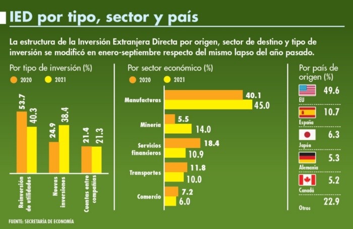 México captó 24 mil 831.7 millones de dólares de flujos de Inversión Extranjera Directa (IED) de enero a septiembre de 2021, un alza interanual de 5.7%, informó la Secretaría de Economía.Como es usual, esta estadística compara cifras preliminares y se ajusta posteriormente conforme haya más información de las operaciones de los periodos correspondientes.“Lo anterior muestra una recuperación de los flujos de IED, en congruencia con la tendencia positiva mundial, de acuerdo con los últimos datos de la Conferencia de Naciones Unidas sobre Comercio y Desarrollo (UNCTAD)”, dijo la Secretaría de Economía en un comunicado.Para períodos similares, se trata del tercer monto más alto considerando los registros en línea, desde 1999, superado por los niveles de 2013 (28 mil 200 millones de dólares) y de 2019 (26 mil 100 millones).Sólo considerando el tercer trimestre del año en curso, las llegadas de IED a México fueron de 5 mil 446 millones de dólares, de los cuales 3 mil 539 millones correspondieron a nuevas inversiones; 333 millones, a reinversiones, y mil 574 millones, a cuentas entre compañías. La cifra total se compara con el desplome de mil 279 millones en el mismo lapso de 2020, ya actualizada.A nivel mundial, el aumento de los flujos de IED en los dos primeros trimestres de 2021 recuperó más de 70% de la pérdida inducida por la pandemia de COVID-19 en 2020.De acuerdo con la UNCTAD, estos flujos en el primer semestre del año actual alcanzaron un estimado de 852 mil millones de dólares, mostrando un impulso de recuperación más fuerte de lo esperado.En forma más amplia, la Organización para la Cooperación y el Desarrollo Económicos (OCDE) publicó un pronóstico actualizado en septiembre de 2021, que estimaba que el crecimiento económico mundial había disminuido en 3.4% en 2020, pero también proyectó que la economía mundial crecería a una tasa anual de 5.7% en 2021 y 4.5% en 2022, asumiendo un fuerte apoyo continuo de las políticas macroeconómicas y políticas monetarias acomodaticias.En México, la IED preliminar registrada para enero-septiembre de 2021 provino de 3 mil 259 sociedades con participación de capital extranjero, 3 mil 721 contratos de fideicomiso y 23 personas morales extranjeras.Por tipo de inversión (origen del financiamiento), la captación de IED a través de reinversión de utilidades abarcó 40.3%, seguida de nuevas inversiones (38.4%) y por cuentas entre compañías (21.3 por ciento).Por sector, las manufacturas tuvieron una cobertura de 45.0%, por delante de minería (14.0%); servicios financieros y de seguros (10.9%); transportes (10.0%); comercio (6.0%) y servicios de alojamiento temporal (4.6%). Los sectores restantes captaron 9.5 por ciento.Y en cuanto al país de origen, Estados Unidos alcanzó 49.6%, seguido de España (10.7%), Japón (6.3%), Alemania (5.3%) y Canadá (5.2%); otros países aportaron el 22.9% restante.Inversión total, estancadaEn contraste con el desempeño positivo de la IED, entre las mayores economías de América Latina, la mexicana es, por mucho, la más rezagada en la reactivación de la inversión privada tras la fase crítica de la crisis económica por la pandemia de COVID-19.Durante el primer semestre del año, la inversión fija bruta (IFB) en México fue 12.2% inferior a la observada durante el mismo lapso del 2019, de acuerdo con cálculos a partir de cifras reportadas por el Instituto Nacional de Geografía y Estadística.En cuanto a recuperación, Brasil va a la cabeza, con un avance de 19% de la IFB en comparación con el primer semestre del 2019, según el Instituto Brasileño de Geografía y Estadística (IBGE).Le siguen Perú con una expansión de 15.2%, Argentina, con un crecimiento de 11.2%; Colombia (+2%) y Chile (+0.6 por ciento).Lo anterior, según cifras reportadas por el Banco Central de Reserva del Perú, el Instituto de Estadística y Censos de la República Argentina (Indec), el Departamento Administrativo Nacional de Estadística de Colombia (Dane) y el Banco Central de Chile.