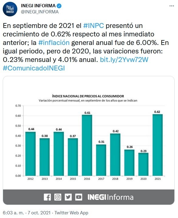 La inflación anual de México subió en septiembre hasta el 6% luego de un aumento de los precios en el noveno mes del año del 0.62% respecto al mes anterior, impulsado por los agropecuarios y los energéticos, informó este jueves el Instituto Nacional de Estadística y Geografía (Inegi).En septiembre de 2020, los datos correspondientes reflejaron un aumento del 0.23% en el índice de precios al consumidor (IPC), con lo que la inflación quedó entonces en el 4.01%."En septiembre 2021 el Índice Nacional de Precios al Consumidor se incrementó 0.62 % mes contra mes. El mayor aumento para dicho mes desde 2008", dijo en Twitter el presidente del Inegi, Julio A. Santaella.En agosto pasado, México registró una tasa de inflación del 5.59%, después de que los precios subieran en el octavo mes del año un 0.19%.Por lo que este dato de septiembre refleja un repunte en los precios al consumidor frente al mes precedente.Además, se aproxima al récord de inflación de abril de 6.08 %, la tasa más elevada desde finales de 2017.El índice de precios subyacente, considerado un mejor parámetro para medir la carestía general porque elimina artículos de alta volatilidad en sus precios, aumentó el 0.46 % mensual y dejó la tasa anual en el 4.92 %, según señaló el Inegi en un comunicado.Dentro del subgrupo de bienes y servicios subyacentes, las mercancías aumentaron el 0.68 % y los servicios crecieron un 0.21 %, con una tasa anual del 6.26 % y del 3.43 %, respectivamente.En los no subyacentes, los agropecuarios aumentaron 1.38 % respecto al mes anterior y los energéticos y tarifas autorizadas por el Gobierno aumentaron 0.87 %.A nivel anual, los precios de los agropecuarios han crecido 10.41 %, mientras que las tarifas energéticas se han elevado un 8.55%.De este modo, la partida de no subyacentes aumentó 1.10 % mes contra mes y aumentó un 9.37 % interanual."Al interior de los precios al consumidor, el componente subyacente subió 0,46 % mes contra mes en septiembre 2021 y el no subyacente 1.10 % para dicho mes. Estos son los mayores aumentos desde 2016 y 2012, respectivamente", indicó Santaella.Por último, el índice de precios de la canasta de consumo mínimo, conformada por 176 productos y servicios, presentó un aumento de 0.78 % y de 6.87 % interanual.El Inegi también anunció que en septiembre el índice de precios al productor, incluyendo el petróleo, presentó una variación al alza del 0.45 % respecto del mes anterior, alcanzando una variación anual de 7.09 %.La reactivación económica en México llegó tras dos meses de suspensión de todas las actividades económicas no esenciales, en abril y mayo de 2020, debido a la crisis del coronavirus, lo que tuvo un fuerte impacto en la producción y el consumo.La inflación de 2020 cerró en 3.15 %, mientras que en 2019 la inflación anual fue del 2.83 % y en 2018 los precios al consumidor se elevaron un 4.83 %.Los precios al consumidor escalaron hasta el 6.77 % a finales de 2017, la tasa más alta desde 2000, que fue motivada por un alza en el precio de los combustibles.La meta del Banco de México es del 3 % anual.El producto interno bruto (PIB) de México se desplomó un 8.2 % en 2020, su peor caída desde la Gran Depresión de 1932 y su segunda contracción anual tras el retroceso del 0.1 % de 2019. IM