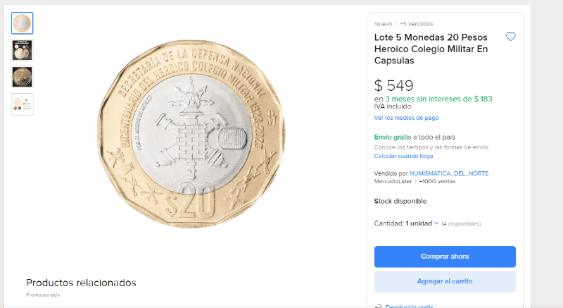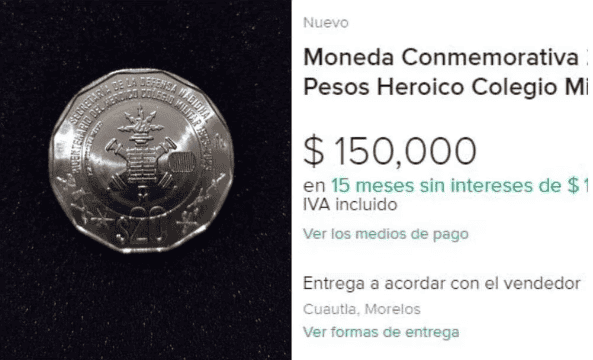 Para los coleccionistas y especialistas en numismática conmemorativas, hay una nueva moneda que ha causado mucho furor. Este 2023 se puso en circulación una pieza que se convirtió en una de las más buscadas. Se trata de la moneda conmemorativa de $20 pesos por el Bicentenario del Heroico Colegio Militar, la cual se puso en circulación el pasado 11 de octubre.Andrés Manuel López Obrador dio a conocer la nueva moneda conmemorativa y luego de un decreto publicado en el Diario Oficial de la Federación, la moneda de 20 pesos comenzó a circular. Y desde entonces hasta ahora es difícil encontrar esta pieza, y por ello es que su valor ha aumentado tanto.En Mercado Libre hay un vendedor osado que la ha puesto a la venta por $150,000 pesos mexicanos. Esta es, la apuesta más cara del mercado, pues hay ejemplares mucho más económicos, pero ¿cómo es la nueva moneda conmemorativa?La nueva moneda conmemorativa de $20 pesos se compone de una aleación de alpaca plateada de 65% cobre, 10% níquel y 25% de zinc en su parte central. Además, el anillo perimétrico en su parte central. Además, el anillo perimétrico tiene como base una aleación de bronce-aluminio cuyo contenido es 92% cobre; 6% de aluminio y 2% de níquel.Además, de acuerdo con el Banco de México, entre las características de la moneda resalta lo siguiente:Si bien un vendedor puso esta oferta en Mercado Libre, hay otros vendedores que la venden por un precio mucho menor. En la misma plataforma, otro usuario puso a la venta con envio a todo el páis, 100 monedas conmemorativas de $20 pesos del Heroico Colegio Militar por $5,399 pesos mexicanosNo obstante, si el interesado hace una búsqueda actual en la plataforma de compra venta, encontrará la misma moneda por un precio muchísimo más económico, desde $500 pesos: Mantente al día con las noticias, únete a nuestro canal de Whatsapp.MM