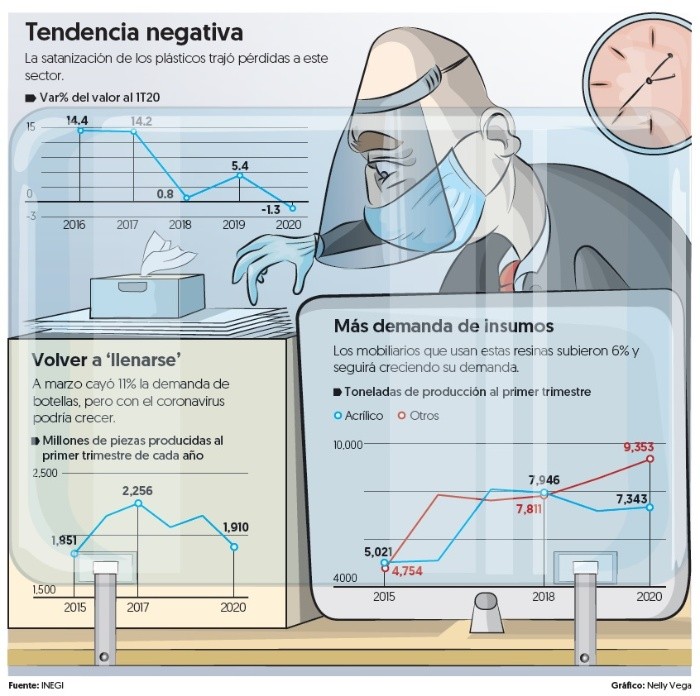 Los plastiqueros enfrentaron en el último año la satanización de sus productos en México, con leyes que prohíben o regulan su comercialización, lo que provocó una caída de 1.3 por ciento en el valor del sector al primer trimestre de 2020, sin embargo, ahora la pandemia de COVID-19 revivió la demanda de plásticos que se usan para cuidar la sana distancia. En el camino a la ‘nueva normalidad’, una vez que supere la emergencia sanitaria del coronavirus, fábricas, oficinas, comercios, gimnasios, centros de atención y en general todas las firmas en las que interactúan los empleados y clientes tendrán que adaptar sus espacios para minimizar el riesgo de contagio dentro de sus espacios. Para ello adquirirán barreras y protectores plásticos como mamparas, máscaras faciales, guantes, caretas entre otros artículos fabricados con acrílicos, poliestireno, plásticos y sus derivados, así como barreras protectoras de separación entre personal. Empresarios y directivos de esta industria consideran que hay una nueva oportunidad para ellos, por lo que tuvieron que cambiar sus líneas de producción –pues ya no maquilan popotes y bolsas- sino que tuvieron que modificar sus planes de negocio, para aprovechar las oportunidades que surgen por el coronavirus y sobrevivir. El mobiliario acrílico será muy relevante en la operación de tiendas y prestadores de servicios, donde firmas como Ifahto, que originalmente se dedica a la producción de eventos, decidió incursionar en la adaptación de oficinas a la ‘nueva normalidad’ “Se avecinan nuevos tiempos. Toda la situación vivida a partir de la pandemia generada por el virus COVID- 19 está obligando a las empresas a tomar medidas estructurales que ayuden a minimizar el riesgo de contagio dentro de los espacios de trabajo. Ya teníamos a los proveedores de acrílico y vimos la oportunidad de hacer estos muebles. Aprovechamos nuestros clientes empresariales para ofrecerles nuestros servicios”, destacó Luis Lambarri, Co-CEO de Ifahto. Roberto Weight, director general de Grupo WOW, contó cómo aprovecharon su capacidad de reciclaje de botellas PET y maquinaria de transformación con la que fabrican láminas de plástico para hacer los protectores faciales que incluso hoy venden por Amazon. “Reciclamos la botella PET hace nueve años, con la cual producimos láminas que se usan para empaque de alimentos, pero ahora hacemos caretas médicas que se sumaron a nuestro portafolio de producto (…) Los ofrecemos a nuestros clientes como restaurantes y hoteles”, dijo. México es líder en acopio de botellas de PET en América Latina y el segundo a nivel mundial, sólo por detrás de Estados Unidos, esto porque 56 por ciento del PET que se consume en México (que se calcula en 782 mil toneladas anuales) se acopia, de los cuales 70 por ciento se recicla en el país. Magali Cortés, directora de relaciones públicas de Plásticos Mixcoac, comentó que su empresa familiar vio una oportunidad en la necesidad de hacer muebles para separar y proteger a trabajadores y clientes. “Lo hacemos para sobrevivir, es difícil llevar un emprendimiento en estos momentos, siempre hemos tenido estos laminados, pero ahora tenemos que adaptarnos y sumar lo que ahora llamamos barreras post-covid. Nos buscan gimnasios, restaurantes, pequeños negocios, todos pensando en lo que viene por el coronavirus”, comentó. En el primer trimestre de 2020 se produjeron en México 7.3 mil toneladas de láminas de acrílico en México, 2.3 por ciento mayor a lo registrado en igual periodo del año pasado, muestran datos del INEGI. Por otro lado, Scarlett Rangel Soriano, Coordinadora de operaciones y gestión comercial de Citrulsa, empresa fabricante de envases, botellas y otros productos plásticos, señaló que tienen destinado actualmente 70 por ciento de su capacidad para botellas usadas en gel antibacterial. “El restante es para shampoo y jabón de manos, nosotros consideramos que hay un pico, siento que el cambio es por la gente”, destacó la directora. El presidente de la Asociación Nacional de Industrias del Plástico (Anipac), Aldimir Torres, reconoció que es importante cambiar del modelo lineal que actualmente se tiene en los plásticos, en el que se consume y se desecha, por uno circular de reciclaje, a pesar de que ahora hay oportunidades de negocio ante la nueva realidad. Resaltó la necesidad de soluciones tecnológicas que impulsen el ecodiseño y los ciclos de vida. Nuestro país genera per cápita por día 1.16 kilos, encabezamos la lista después de Chile con 1.15 y Argentina con 1.14. Es urgente la aplicación de políticas públicas en donde se tome en cuenta la Economía Circular”, dijo.