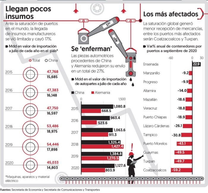 ¿Su producto favorito no se encuentra disponible? desde hace unas semanas Nescafé Dolce Gusto muestra en su sitio de ventas online una leyenda que dice “Estamos experimentando intermitencias en el stock de ciertas variedades derivado de la contingencia. Agradecemos tu comprensión”. No son los únicos.La pandemia del coronavirus, con la suspensión gradual en el mundo de distintas operaciones no esenciales desde el primer semestre del año, rompió las cadenas de suministro de varias empresas.En el caso de México la afectación fue directamente a la importación de insumos provenientes de Asia y Europa, ya que muchas firmas procedentes de estos continentes cerraron sus plantas en el primer semestre del año, pero ahora que comenzaron a regresar crearon una saturación en los puertos y barcos mercantes globales, que terminó por romper la cadena de suministro.Super Flama, uno de los mayores productores de estufas en México, tuvo que sustituir hasta 50 por ciento de su proveeduría importada con empresas nacionales, lo que generó retrasos.“No es un tema de aumento en costos, es un tema de retrasos, y las tiendas nos penalizan si no entregamos producto a tiempo”, explicó Bernardo Vallejo, director general de la empresa en entrevista con El Financiero.“Después de meses de estar cerrados en China, ahora están vendiendo mucho y se rompió la cadena (de suministro), hay saturación en el mundo, por eso hay un retraso en contenedores del doble o el triple de lo normal (…) estamos sustituyendo con proveedores nacionales”, contó Vallejo.En los primeros siete meses del año, la importación de máquinas, aparatos y material eléctrico a México cayó 17 por ciento anual, siendo la mayor reducción desde la crisis económica global, de acuerdo con datos de la Secretaría de Economía.En este rubro China, principal proveedor de estos productos a México, vio caer 17.3 por ciento anual sus exportaciones al país, frente a lo registrado en los primeros siete meses de 2019, siendo el valor más bajo desde 2012, y la mayor caída desde que se tiene registro.Al respecto, productores de línea blanca, alimentos y hasta automóviles, reconocen que ante la saturación de importaciones se vieron obligados a buscar proveedores locales e incluso retrasar entregas, con la consecuente alza en los costos de operación.“Es un problema general, hay menos barcos, hay una saturación sin duda por aumento en fletes, nosotros por proyecciones e inventarios es que la realidad es que no tenemos un atraso aún, pero estamos sujetos a esta disponibilidad, esperamos que mejore hacia el cierre del año”, reconoció Elías Massri, director general de Giant Motors Latinoamérica, firma que ensambla los autos de la marca china JAC en México.Entre enero y julio de este año, México importó 18.6 por ciento menos autopartes en valor provenientes de China, en comparación con el mismo periodo del 2019.Mientras que Alemania –principal país europeo proveedor de piezas para este sector de autopartes en México– exportó a ‘tierra azteca’ 36.7 por ciento anual menos valor, comparado con lo reportado en los primeros siete meses de 2019.“La crisis sanitaria por el coronavirus COVID-19, añadió una variable adicional a la tendencia en cambio de cadenas de suministro. Ahora con el coronavirus se busca tener cadenas de suministro más resilientes”, afirmó Carlos Zegarra, socio líder de Management Consulting de PwC México.Entre enero y septiembre de 2020, se importaron un millón 985 mil 664 contenedores llenos, 13.7 por ciento inferior a lo registrado en igual lapso del año pasado, informó la Secretaría de Comunicaciones y Transportes (SCT).El puerto de Manzanillo, Colima, fue el más relevante en este periodo, pues por esta vía llegaron 915 mil 925 contenedores llenos, sin embargo, esta cantidad es 9.2 por ciento menor a lo reportado en igual lapso de 2019.Después el puerto de Lázaro Cárdenas en Michoacán, reportó la llegada de 344 mil 837 contenedores ocupados, 26.1 por ciento debajo de lo registrado entre los primeros nueve meses del año pasado.En cambio, sólo el puerto de Ensenada, Baja California, aumentó la entrada de contenedores llenos en 22.9 por ciento, en dicho periodo.
