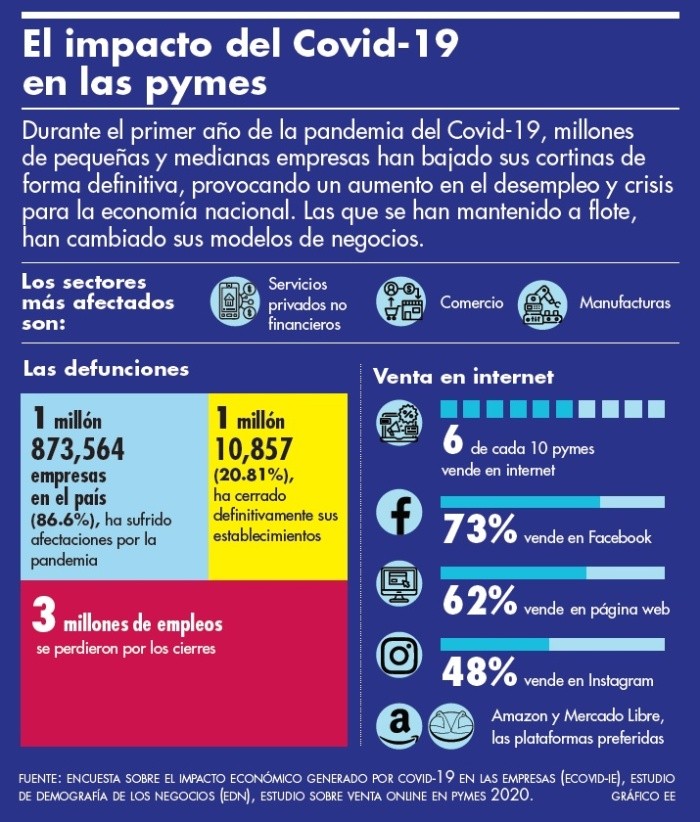 Durante 45 años, Amparo Martínez se ha dedicado al sector de reparación de electrodomésticos, también vende partes y accesorios de los mismos; sin embargo, por la pandemia su negocio ya no ha sido el mismo.“Siempre he sido muy trabajadora y dedicada, pero desde que empezó lo de la pandemia he perdido ritmo, ya no abro todos los días y he cambiado la forma de operar”, reveló en entrevista con El Economista.Como Amparo, millones de negocios en el país han sufrido daños por la pandemia. Datos de la segunda edición de la Encuesta sobre el Impacto Económico Generado por Covid-19 en las Empresas (ECOVID-IE), realizada por el Instituto Nacional de Estadística y Geografía (Inegi), indican que un millón 873 mil 564 empresas en el país (86.6%), ha sufrido diferentes afectaciones por la pandemia.En total, 79.2% consideró que la principal es la disminución de ingresos, con una afectación de 48.6%, es decir, la situación se redujo en casi seis puntos porcentuales y ocho puntos en la afectación de ingreso en comparación con la primera edición de la encuesta realizada entre abril y mayo, donde la afectación de ingresos fue el mayor problema para 85.1% de las organizaciones.El segundo problema al que se enfrentaron la baja demanda. En la primera encuesta 67.6% de las empresas lo padecieron, mientras que para la segunda edición se redujo a 51.2 por ciento. En porcenaje de afectación, la cifra pasó de 54.6 a 47.9 por cientoMuerte de empresasA un año del inicio de la pandemia en México, los daños no cesan siendo el más catastrófico el cierre definitivo de negocios, que suman un millón 10 mil 857 (20.8%), revela el estudio Demografía de los Negocios (EDN) 2020 publicado por el Inegi.Si se toma en cuenta que de los 4.9 millones de establecimientos en el país, 99.8% son micro, pequeños y medianos, el cierre representa una crisis económica para el país.Los tres sectores que más han sufrido la muerte de empresas son los de servicios privados no financieros (24.9%), comercio (18.9%) y manufacturas (15 por ciento). Oaxaca es el estado con menos establecimientos “muertos” con 13.70%, mientras que Quintana Roo (31.8%) y Baja California Sur (28.1%) fueron los que mayores cierres tuvieron.Los cierres definitivos generaron la perdida de tres millones de empleos, mientras que los comercios que siguen operando, prescindieron de 1.15 millones de personas, sumando así 4.12 millones de desempleados.En un caso similar está la empresa Orígenes Orgánicos, dedicada a la venta de productos naturales, orgánicos y saludables, que a principios de la pandemia tuvo que recortar 20% del personal.“Al principio sí tuvimos que recortar al personal. Comenzamos a enfocarnos más en la venta en línea, a domicilio e ingreso a tiendas de autoservicio, con lo que esperamos recuperar la plantilla perdida”, revela Yonatan Okón, el CEO de la marca.Cambio de modeloLas empresas han cambiado sus modelos de negocio, ya sea con servicios a domicilio, citas, venta en línea o incursionando en otros sectores. Ejemplo de ello es el negocio de Yessica Urbina, quien tenía un restaurante de hamburguesas llamado “Las Carnes de la Gorda”, ubicado en el Estado de México, y que tuvo que cerrar sin saber si volvería a abrir. Tras evaluar cómo retomarlo, se cambió a Dark Kitchen, que garantiza la comodidad y seguridad tanto para empleados como clientes.“Llevamos en esta modalidad unos dos meses. Parece que está teniendo muy buena aceptación y nos está dando nuevas ideas para adaptar el proyecto a un modelo de franquicias de baja inversión”, dijo.Ahora el servicio lo ofrecen a domicilio de jueves a domingo y los pedidos son tomados vía WhatsApp o a través de Facebook e Instagram.Otro modelo que cambió fue el de Yonatan, quien al tener tiendas de alimentos no cerró sus tres sucursales en Ciudad de México; sin embargo, las ventas bajas y prescindir de empleados lo llevó a lanzar su marca de alimentos e incursionar en las tiendas de autoservicio como CityMarket y HEB. Su meta es subir 30% su presencia en tiendas.Si bien el modelo ya lo venía pensando desde antes de la pandemia, fue la crisis lo que aceleró el proceso. Uno de sus logros fue ingresar al Palacio de Hierro como proveedor de snacks saludables a granel. A pesar de que el panorama no es el mejor, reinventarse fue la solución.