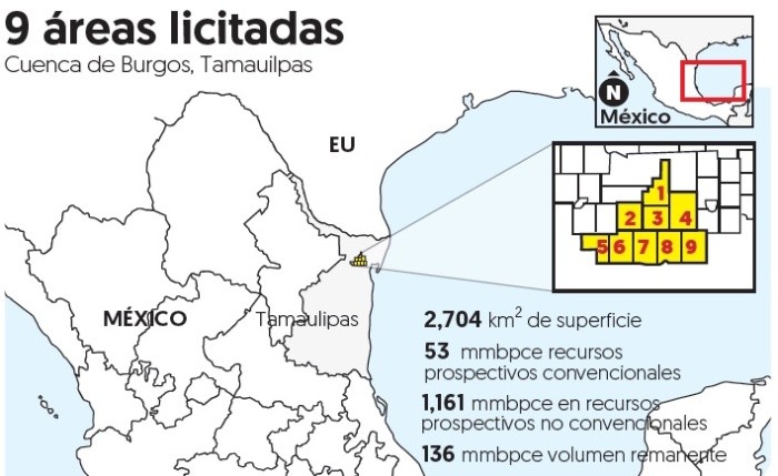 Un total de nueve áreas terrestres no convencionales, con recursos conocidos como shale, conforman la Ronda 3.3 la cual buscará atraer la inversión de privados en la provincia de Burgos, en el norte de Tamaulipas. “Los recursos prospectivos estimados son tres veces mayores al volumen que se determinó para las 46 áreas que se han adjudicado anteriormente en cuencas terrestres”, explicó Pedro Joaquín Coldwell, secretario de Energía. La licitación, que será bajo un contrato de licencia, tiene un potencial productivo principalmente de gas seco y gas húmedo; cuenta con 53 mil millones de barriles de petróleo crudo equivalentes (mmbpce) de recursos prospectivos convencionales y mil 161 mmbpce en recursos no convencionales. De acuerdo con el subsecretario de Hidrocarburos, Aldo Flores Quiroga, serán seis municipios los que se verán beneficiados directamente; asimismo, estimó una inversión de dos mil 343 millones de dólares si todas las áreas fueran adjudicadas. La región cuenta con infraestructura industrial y petrolera, entre ellas 18 pozos exploratorios horizontales; los puertos de Matamoros y Tampico, así como los gasoductos de Tamaulipas y Los Ramones. La vigencia del contrato es de 30 años con posibilidad de dos prórrogas de cinco años cada una durante la producción comercial.