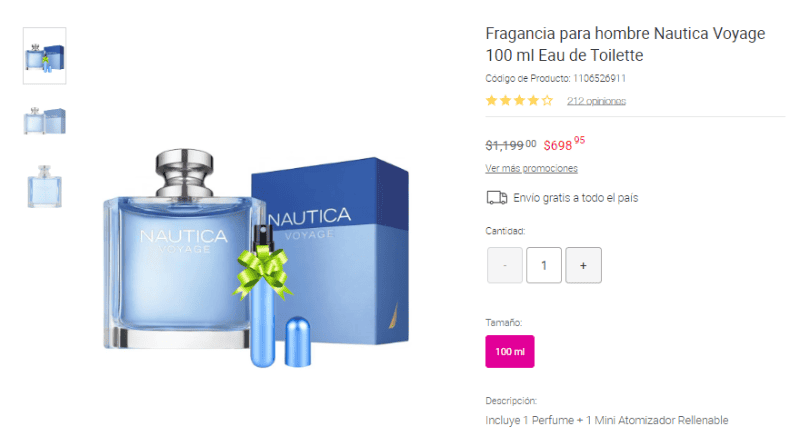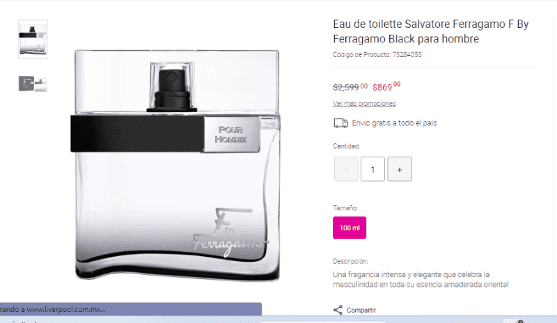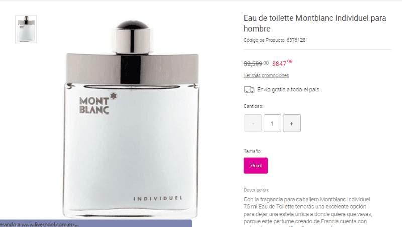 Previo a que llegue El Buen Fin a México, la tienda departamental Liverpool ha puesto grandes descuentos en su tienda en línea. Si estás buscando comprar un perfume para varón, te invitamos que revises estas promociones.Para adquirir estos productos, tendrás que entrar al sito web de Liverpool y en su sección de Belleza podrás constatar que estos perfumes tienen el 40 por ciento de descuento y un poquito más.Este perfume para hombre en su presentación de 100 ml pasó de costar $1,199 a $698 pesos. Esto significa que tiene 41.78% de descuento.En caso de comprar en la tienda en línea, no necesitas pagar por envío, pues Liverpool tiene envíos gratis a todo el país. Este perfume elegante para hombre tiene hasta el 66% de descuento, pues pasó de $2,599 pesos a $869 pesos. ¡No te pierdas la oportunidad de comprarlo para esta Navidad!Este hermoso y elegante perfume, perfecto para un regalo o para usarlo en una ocasión especial pasó de costar $2,599 a $847 pesos, lo que implica que tiene hasta un 67% de descuento.Mantente al día con las noticias, únete a nuestro canal de WhatsappMM