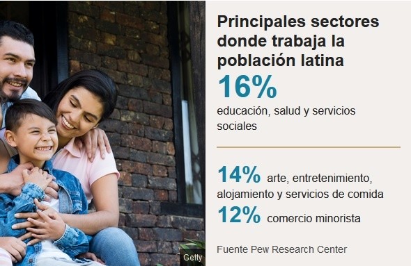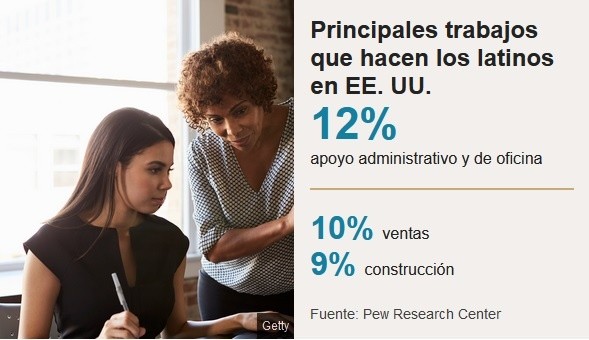 El estereotipo de los latinos que abunda en las películas de Hollywood retrata a los hombres de esta comunidad como inmigrantes pobres que trabajan en el campo y la construcción (si no son pandilleros o traficantes de droga), y a las mujeres como limpiadoras.Sin embargo, la mayor parte de los 60 millones de latinos que vive en Estados Unidos tiene un empleo relacionado con la educación, la salud y los servicios sociales, según el centro de estudios Pew Research Center.Es cierto que muchos no han terminado la secundaria y que sus salarios -en promedio- son bajos. Pero con las distintas oleadas migratorias de las últimas décadas y el aumento de los latinos nacidos en EE.UU., su situación laboral ha ido cambiando.Por ejemplo, en el transcurso de una década los latinos que trabajan en negocios, finanzas o que son jefes aumentaron de 6,7% a 8%, mientras que los negocios de emprendedores de esta comunidad también crecieron.Los latinos generan US$2,3 billones al año, según los cálculos de la Cámara Hispana de Comercio, con sede en Washington D.C."Si nosotros fuéramos un país, seríamos la octava economía más grande del mundo", le dice a BBC Mundo Ramiro Cavazos, presidente y director ejecutivo de la organización.Actualmente uno de cada cinco estadounidenses es de origen latino, según la Oficina del Censo de Estados Unidos. En 2060, se espera que sean uno de cada cuatro, llegando a un total de 119 millones de personas.Con eso en mente, es difícil discutir que esta comunidad juega un rol clave en la economía de la primera potencia del mundo.Y aunque el bajo nivel educativo de parte de los latinos supone un impedimento para que puedan acceder a mejores trabajos, los expertos proyectan que en las próximas décadas la situación mejore."El tipo de trabajo que hacen los latinos ha cambiado en los últimos años", le dice a BBC Mundo Mark López, director de investigación en migración global y demografía del Pew Research Center."Menos latinos trabajan en el sector de la construcción comparado con años anteriores y más latinos trabajan en negocios o supervisión de empleados", explica López.Por sectores productivos, donde más trabajan los latinos -después de los empleos en educación, salud y servicios sociales-, es en la categoría que agrupa artes, entretenimiento, recreación, alojamiento y servicios de comida.En tercer lugar está el comercio minorista.Otra manera de analizar en qué trabajan los latinos es buscar cuáles son las ocupaciones específicas que realizan, explica Mark López.En este caso, el ranking está liderado por los empleos de apoyo administrativo y de oficina, seguidos por ventas y construcción, un sector este último con oficios que requieren distintos grados de especialización, que van desde lo más básico, hasta el manejo de maquinaria o de sistemas eléctricos, de agua o calefacción, además de supervisores, jefes de obra o ingenieros.El sector dónde más han aumentado los empleos hechos por latinos es el de preparación y servicio de comida.El ingreso medio anual de los latinos que trabajan a tiempo completo es de US$30.000.Los latinos son los que tienen los salarios más bajos, comparados con los de la población blanca, negra y asiática.De hecho, los asiáticos son los que tienen el mayor nivel de ingresos (con una media de US$54.000 al año), seguidos por los empleados blancos y los trabajadores negros.Si miramos la evolución del salario medio de un trabajador latino empleado a tiempo completo desde 1990, el panorama no es muy alentador: se mantiene prácticamente igual, según los datos del Pew Research Center.Sin embargo, sí ha crecido en el caso de los trabajadores por horas. Y por otro lado, el dinero que genera una familia -medido como el ingreso total del grupo- también ha aumentado.Hay 4,3 millones de negocios en el país cuyos dueños son latinos. Éstos generan más de US$700.000 millones, según la Cámara Hispana de Comercio.Sin embargo, la falta de acceso a créditos bancarios sigue siendo uno de los mayores desafíos para los emprendedores latinos, asegura Ramiro Cavazos.Pero como más latinos están entrando a la fuerza laboral, son más jóvenes y tienen más estudios superiores que en el pasado, Cavazos cree que el poder económico de la comunidad seguirá creciendo en los próximos años.De hecho, Mark González, del Pew Research Center, dice que en la última década la educación de los latinos ha comenzado a mejorar y cada vez es más habitual "ver latinos en empleos que requieren un grado de bachiller".Gonzalo Huertas y Jacob Funk Kirkegaard, investigadores del centro de estudios Peterson Institute for International Economics (PIIE), publicaron un análisis este año sobre los latinos que emprenden negocios en Estados Unidos."Los latinos tienen el mayor nivel de capacidad emprendedora en comparación con otros grupos en Estados Unidos", le dice a BBC Mundo Gonzalo Huertas."Esto va en contra de la percepción falsa de que los latinos son una fuerza de trabajo de baja calidad".El experto coincide con que el aporte de la comunidad latina al crecimiento de la economía estadounidense aumentará en los próximos años, dado que crecerá el número de personas en edad de trabajar, un fenómeno conocido como bono demográfico.Pero en lo que también coinciden los expertos es en que hay un rezago educacional. "Los latinos aún están muy por debajo del resto de los grupos", apunta Huertas.Pese a ese problema, agrega, "los latinos están ganando terreno y su trabajo se está volviendo más productivo".*Esta nota es parte de la serie "¿Hablas español?", un viaje de BBC Mundo por Estados Unidos para mostrar el poder de nuestro idioma en la era de Trump.Ahora puedes recibir notificaciones de BBC Mundo. Descarga la nueva versión de nuestra app y actívalas para no perderte nuestro mejor contenido.JM