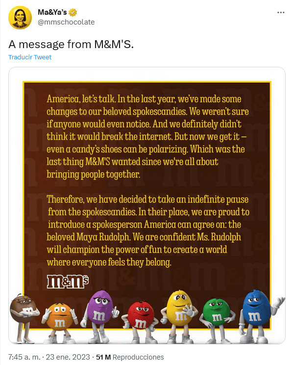 El pasado 23 de enero, la reconocida marca de chocolates M&M informó en un comunicado que decidió dejar de usar a los populares personajes de colores en sus anuncios publicitarios debido a la ola de comentarios que comenzaron a producirse en septiembre de 2022.¿Qué fue lo que pasó? El año pasado, la empresa lanzó un nuevo color de "spokecandies" (voceros de los dulces); de color violeta, se explicó en aquel tiempo que el personaje representaba lo femenino, y poco tiempo atrás se habían dado a conocer ya otros dos caracteres en color verde y café que fueron creados para representar la "aceptación y la inclusión".Muchos usuarios de redes sociales comenzaron de inmediato a criticar a los nuevos personajes de M&M, señalando que el color violeta o morado se utiliza en apoyo a la comunidad LGBT+. Luego, la polémica creció cuando en enero se lanzó un paquete que incluía dulces solo de este color, además del verde y el café.La idea fue muy criticada por la cadena de noticias conservadora Fox News y por supuesto, cibernautas se unieron a la guerra de mensajes en Internet.La compañía publicó en Twitter el mensaje en el que explicaba la decisión de dejar de usar a los M&M de colores: "Estados Unidos, hablemos. En el último año, hicimos algunos cambios en nuestros queridos voceros. No estábamos seguros de si alguien se daría cuenta. Y definitivamente no pensamos que esto rompería el Internet. Pero ahora lo entendemos: incluso los zapatos de un dulce pueden ser polarizantes. Que era lo último que querían los M&Ms, ya que nuestro objetivo es unir a las personas".Además de informar que se iba a poner en pausa a los personajes indefinidamente y, se dijo que serían reemplazados en las nuevas campañas por la actriz y comediante Maya Rudolph. "Estamos seguros de que la Sra. Rudolph defenderá el poder de la diversión para crear un mundo en el que todos sientan que pertenecen", finalizó M&M.La nueva medida también ha causado una lluvia de todo tipo de comentarios en las redes sociales.OF