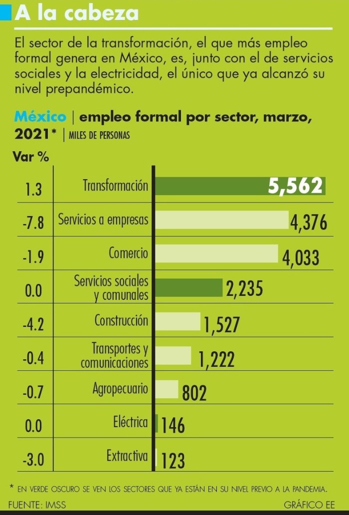 El empleo formal en el país no ha logrado recuperar las plazas laborales que se cancelaron como consecuencia de la pandemia; en el primer trimestre de este año se generaron 251 mil 977 puestos de trabajo, cifra que supera hasta cuatro veces lo reportado en 2020, pero que está por debajo a lo creado en 2019 y 2018, revelan los datos del Instituto Mexicano del Seguro Social (IMSS).Tan sólo en el mes de marzo, los empleadores sumaron 88 mil 771 puestos de trabajo, de los cuales 57 mil 844 son de carácter permanente; mientras que 30mil 927 son temporales; esto es un incremento equivalente a una tasa mensual de 0.4 por ciento.El IMSS destacó que en los últimos doce meses se registró una disminución de 457 mil 234 puestos, equivalente a una tasa anual de -2.2 por ciento.La suma de los empleos del primer trimestre de 2021, no alcanzan a cubrir las plazas que se cancelaron tan sólo en el mes de diciembre de 2020, cuando se reportó una baja de 277 mil 800 empleos formales; “y a esto hay que sumarle la demanda de empleo de la fuerza laboral que se incorporar a la Población Económicamente Activa”, señaló José Luis de la Cruz, director del Instituto para el Desarrollo Industrial y el Crecimiento Económico.De la Cruz detalló que los empleos creados en el tercer mes del año solo reflejan la apertura de algunos sectores, luego del confinamiento, y es también un reflejo de la nula inversión en lo que resta del año, por lo que el mercado laboral se verá muy afectado y sólo podría alcanzar al cierre del 2021 alrededor de 550 mil puestos de trabajo.De acuerdo con el presidente de la Asociación Mexicana de Empresas de Capital Humano (AMECH), Héctor Márquez, los tres primeros meses del año son clave para la recuperación del empleo, por lo que el pronóstico para lo que resta del 2021 no es alentador, “en este año no se logrará la recuperación de los empleos perdidos por la pandemia”, apuntó.Por su parte, Guillermina Rodríguez, subdirectora en el área de Estudios Económicos de Citibanamex, explicó que los más de 88 mil puestos de trabajo de marzo es positivo, pero insuficiente, “aún hay perdidos más de 587 mil empleos; pero sigue la recuperación paulatina”.En entrevista explicó que un aspecto fundamental para que se mantenga la recuperación, que en promedio en el año será de 100 mil plazas laborales, será la vacuna, “creemos que conforme avance la vacunación y se vea un ritmo más sostenido habrá más certeza para la recuperación económica y con ello el empleo”.Detalló que hay sectores económicos que empezaron a llamar la atención, por ejemplo el de la transformación, “el cual pronosticamos que es el que más va a repuntar en este año y es probablemente un sector que dirija la recuperación económica.En todo lo que son las manufacturas ya vemos signos claros de recuperación, hay algunas entidades del país —menos afectadas por la pandemia— como Baja California y Chihuahua en las que, con las expectativas de crecimiento de Estados Unidos se ve una ventana de oportunidad y crecimiento y generación de empleo”.Al respecto, los datos del IMSS indican que los sectores con crecimiento anual en puestos de trabajo son transformación con 1.3%, electricidad y servicios sociales y comunales, ambos con 0.02%. Por entidad federativa, Tabasco, Baja California y Chihuahua continúan con variación anual positiva. Para este mes, se suman a este grupo Nayarit, Zacatecas y Sonora.En el caso de los sectores con mayores dificultades, como el de la construcción y los servicios, Guillermina Rodríguez destacó que tendrán una recuperación más lenta. Conforme se empiecen a abrir más las actividades y la distancia social se relaje pudieran generarse más empleos.