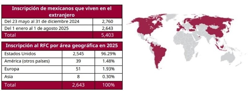 El Servicio de Administración Tributaria (SAT) informó que, a través de Oficina Virtual, 5 mil 403 personas mexicanas residentes en el extranjero, que viven en más de 40 países, se han inscrito al Registro Federal de Contribuyentes (RFC).A partir de la firma del convenio del SAT con la Secretaría de Relaciones Exteriores, y como parte de los compromisos establecidos con el Instituto de Mexicanas y Mexicanos en el Exterior (IMME), de mayo de 2024 a agosto de este año se han logrado avances significativos en el acceso a servicios fiscales para los connacionales que no viven en el país. En tanto, del 1 de enero al 1 de agosto de 2025, se han inscrito al RFC por este canal de atención 2 mil 643 personas mexicanas en el extranjero con residencia en 43 países, siendo Estados Unidos el principal con 2 mil 545 trámites realizados desde 48 ciudades.La dependencia detalló que el número de inscripciones refleja el impacto positivo de las acciones coordinadas entre el SAT y el IMME, orientadas a la inclusión fiscal y la simplificación de trámites.Cabe señalar que la Oficina Virtual permite a la ciudadanía realizar trámites y recibir orientación en tiempo real, por medio de una videollamada con personal especializado del SAT, sin necesidad de acudir a una cita de forma presencial.Para realizar la inscripción al RFC desde el extranjero, se deben seguir los siguientes pasos y requisitos: Agendar una cita en citas.sat.gob.mx, seleccionar "Inscripción al padrón de contribuyentes personas físicas" y elegir "Oficina Virtual Inscripción de mexicanos que viven en el extranjero".El SAT reafirmó que estas acciones forman parte de una estrategia integral para acercar sus servicios a las y los connacionales, sin importar en qué parte del mundo se encuentren.NA