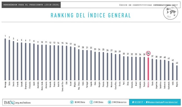 A pesar de que la competitividad de México mejoró del 2016 al 2017, al subir del sitio 37 al 36, en el Índice de Competitividad Internacional 2017 del Instituto Mexicano para la Competitividad (IMCO), el país se mantuvo entre los 10 menos competitivos del mundo.Las mayores preocupaciones tienen que ver con la problemática en violencia y corrupción que se vive en el país, de acuerdo con el instituto.De los 10 subíndices que se miden, la economía mexicana subió en seis: derecho, medio ambiente, sistema político, mercado de factores, economía y relaciones internacionales.Mientras que se mantuvo en el mismo lugar en cuatro: sociedad, gobiernos, precursores e innovación.Si bien avanzó, no logró mejorar con respecto a los otros países, lo que lo llevó a quedar en los últimos 10 sitios junto con Colombia, Turquía, Rusia, Argentina, Sudáfrica, Indonesia, Guatemala, India y Nigeria que quedó en el último lugar.El director general del IMCO, Juan Pardinas, dijo que estamos en el peor año de inseguridad y homicidios, algo que preocupa, porque no se han tomado acciones para combatir la corrupción y reconstruir la seguridad pública, como reformar el artículo 102 para tener una fiscalía que sirva.Para el IMCO, ante la falta de Estado de derecho las perspectivas son que "de no enfrentarse, México será un país más pobre, violento y con menos oportunidades de prosperidad".OA